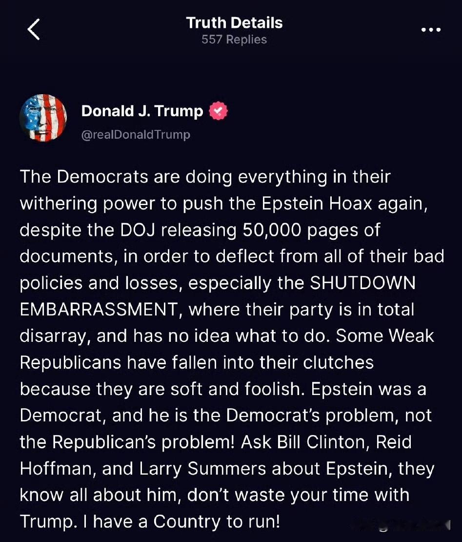 特朗普回应这两天公布的爱泼斯坦文件,建议媒体去问克林顿等人,“我有国家要治理” “民主党正在竭尽所能再次炒作爱泼斯坦骗局,尽管司法部已经公布了 5 万页的文件,他们这样做是为了转移公众对其糟糕政策和失败的关注,尤其是政府停摆的尴尬局面,让其党派陷入混乱,不知所措。一些软弱的共和党人落入了他们的圈套,因为他们软弱又愚蠢。爱泼斯坦是民主党人,这是民主党的问题,不是共和党的问题! 问问比尔·克林顿、里德·霍夫曼和拉里·萨默斯关于爱泼斯坦的事,他们全都知道,别浪费时间在特朗普身上,我有国家要治理!”