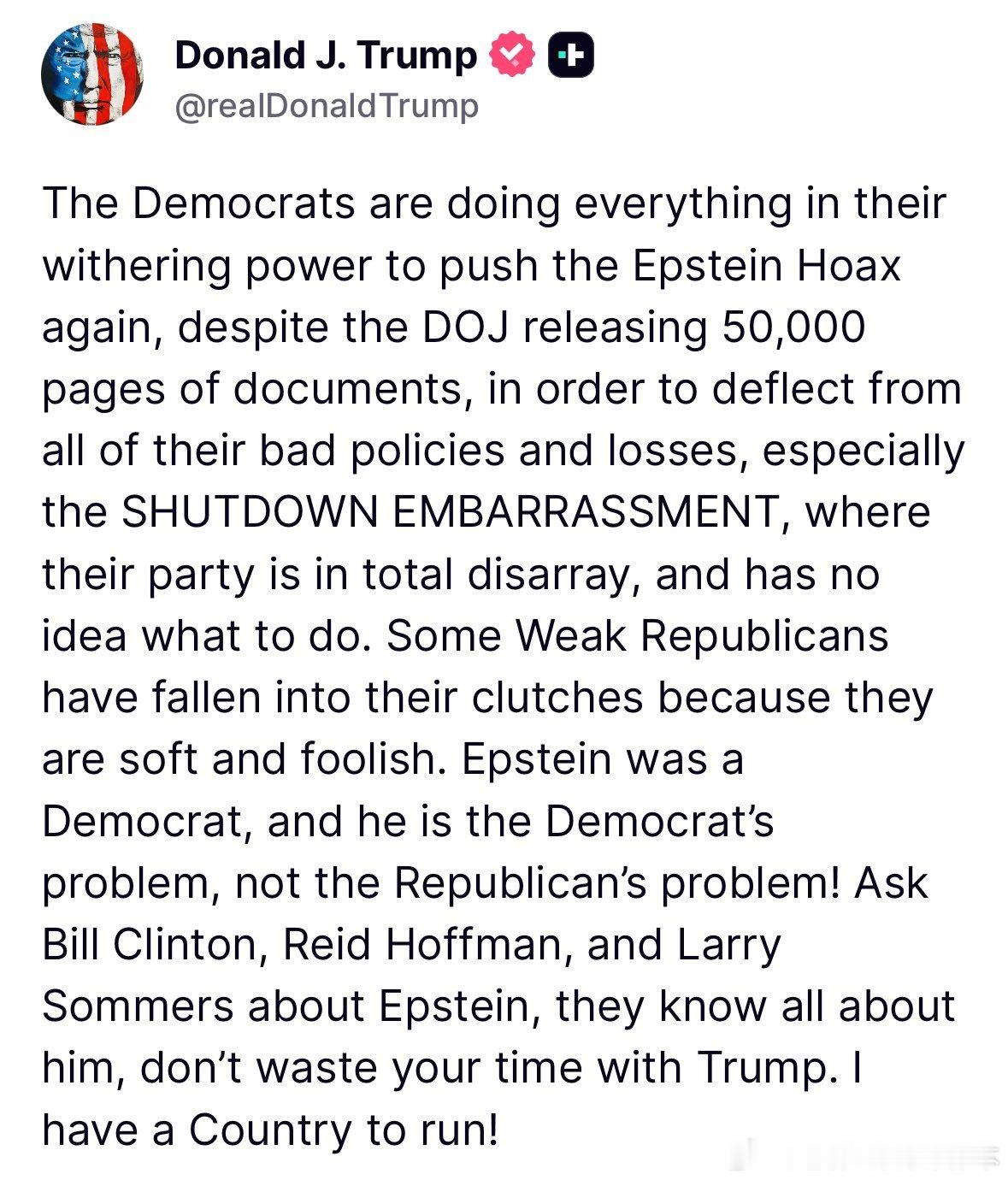 【黄金时代】川普敬告,爱泼斯坦案该找谁找谁,别在他身上浪费时间,因为没用川普:民主党人正竭尽他们那点日渐衰弱的力量,再次推动所谓的“爱泼斯坦骗局”,尽管司法部已经公布了 5 万页文件。他们这么做是为了转移人们对其糟糕政策和失败的注意力,尤其是那场让人难堪的政府关门——他们的政党如今完全乱作一团,根本不知道该怎么办。一些软弱的共和党人因为缺乏立场和头脑,被他们诱骗进去。爱泼斯坦是民主党人,他是民主党的麻烦,不是共和党的麻烦!去问比尔·克林顿、里德·霍夫曼和拉里·萨默斯关于爱泼斯坦的事吧——他们全都清楚。别把时间浪费在我身上。我还有国家要治理!