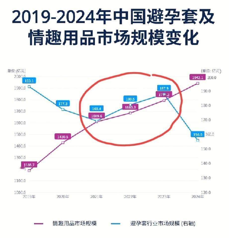 知名投资研究平台给出的“2019-2024年中国避孕套及情趣用品市场规划变化”图表,发现一个有趣的现象,2021-2023的两年前,两个市场都实现了正增长。 按道理来说,这两个市场是互为竞争的关系,放在一个图表里面,都是此消彼长、东升西落的这么一种走势。怎么在这两年里,两个市场都实现了正增长呢? 有没有专业人士出来解读一下? 而关于情趣用品市场逐年增加的这个话题,网友吐槽道:X生活,可能越来越不需要两个人做了!!!