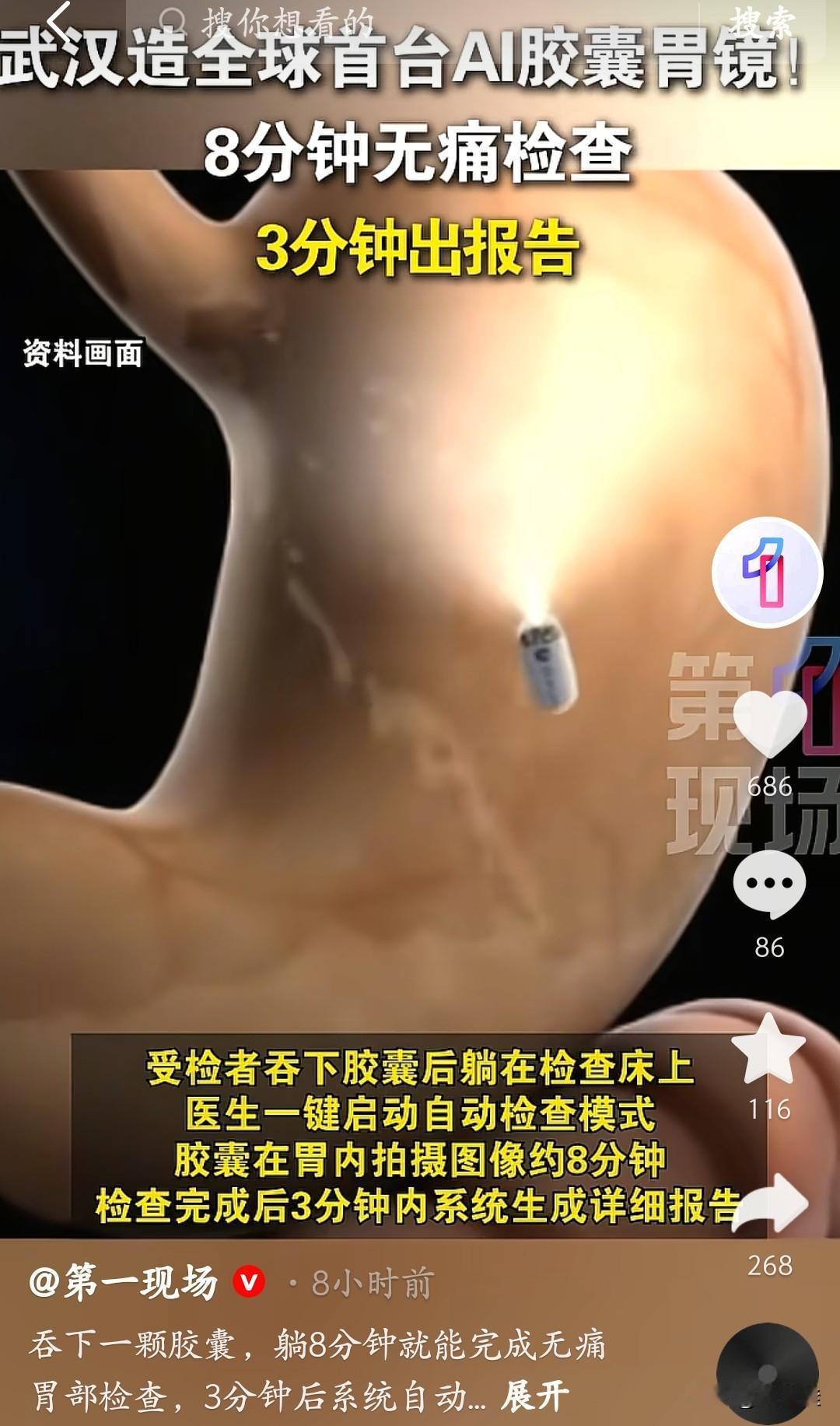胶囊在胃里自动拍图,AI阅片灵敏度99%以上,以前医生看胃和小肠的片子要96分钟,现在5分钟搞定。而且一个医生能同时管3台设备,4小时能做60例检查,效率直接起飞! 现在这设备已经进了全球超百家医院,怕做胃镜难受的朋友,这下终于不用遭罪啦!