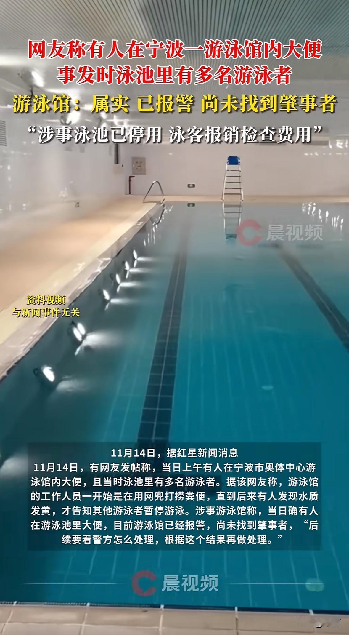 11月14日上午,宁波奥体中心游泳馆热身池里,有人当着多名泳客的面大便。工作人员起初只拿网兜打捞,直到有人发现水质发黄才通知暂停游泳。目前场馆已报警,没找到肇事者,涉事热身池要封到12月底,改开放比赛池,受影响顾客能报销体检费、延长7天泳期。 这事儿也太没公德心了!公共泳池是大家共用的,粪便里的细菌可能危害他人健康,还得让场馆花大代价换水维护。律师说这种行为不仅要受道德谴责,还可能被罚款、行政拘留,得赔场馆损失。希望能尽快找到当事人,也提醒大家,公共场合得守规矩,别只顾自己舒服,让别人糟心。