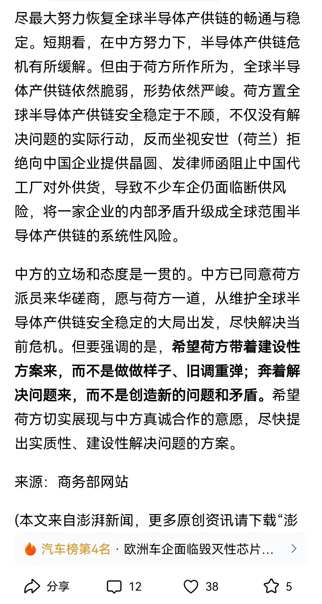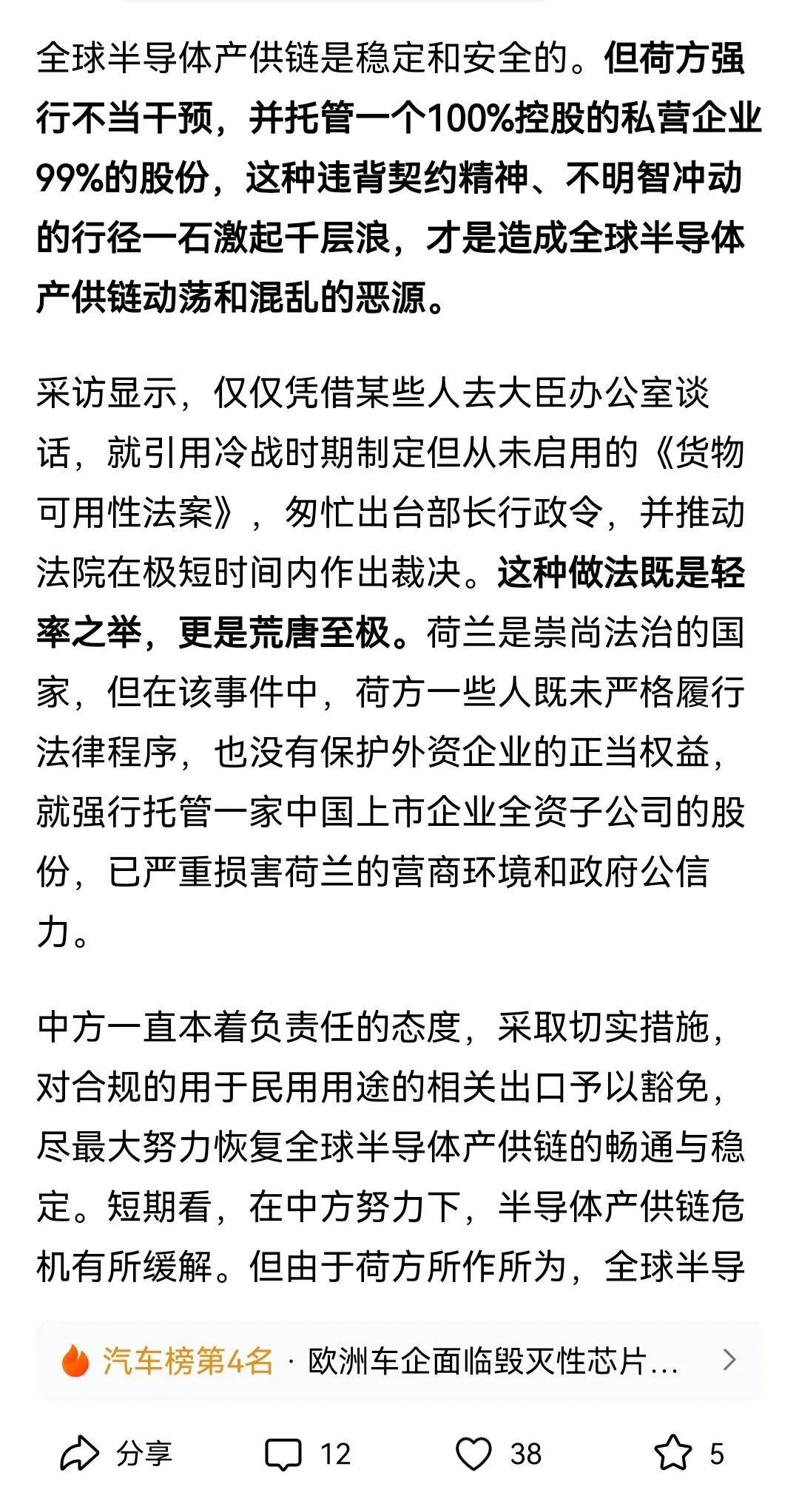 闻泰科技接下来可以这么干: 1、安世将总部撤出荷兰,理由是在荷兰有被剥夺公司控制权的风险,会导致公司失控。 2、安世总部不要移回国内,而是随便哪个欧盟国家都可以,这样能堵住欧盟的嘴。移回国内可能整个欧盟都会替荷兰发声,而且销售链会受影响。 3、以后安世新总部就是个空壳子,财务权一定不能被当地政府控制,可以多建分公司或者其他方法,分担财务一地风险。 4、安世新总部甚至可以选择设立在离荷兰最近的几个国家,恶心一下它。