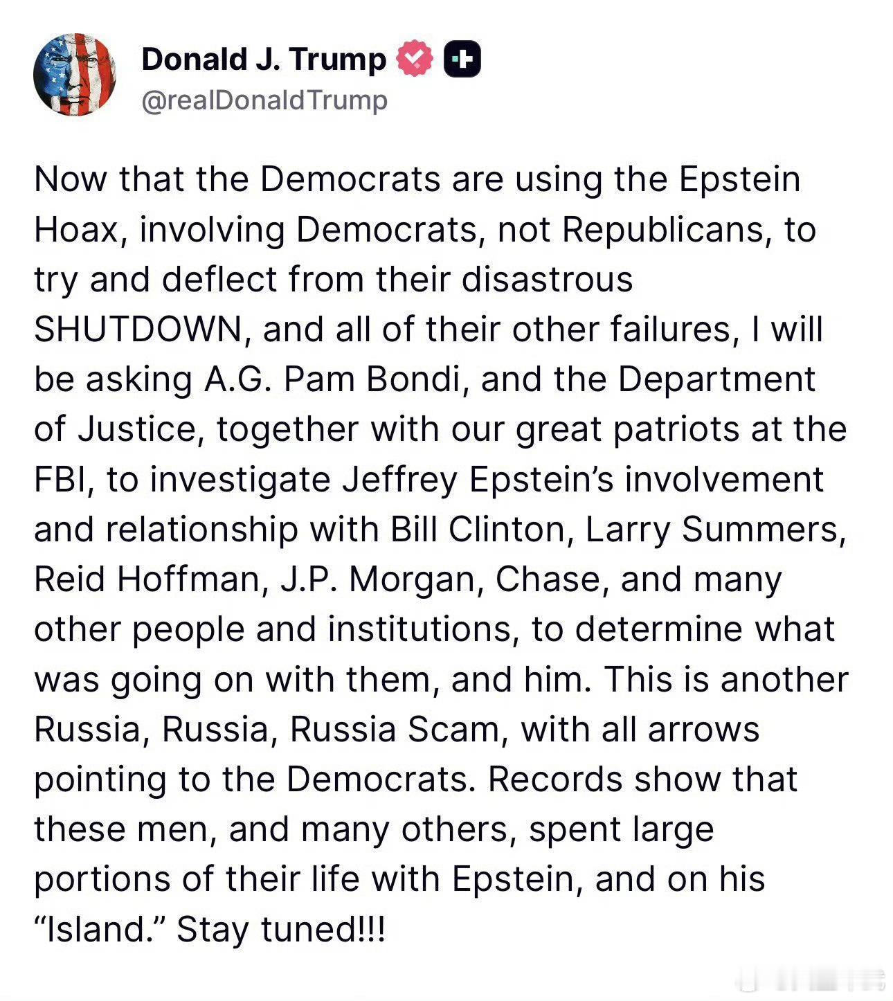 笑死,特朗普宣布,他将指示司法部和联邦调查局调查杰弗里·爱泼斯坦与比尔·克林顿、拉里·萨默斯、里德·霍夫曼、摩根大通以及其他许多人的牵连。“记录显示,这些人一生中的大部分时间都与爱泼斯坦在一起,并在他的‘岛上’度过。敬请期待!” 名单里排第一的不应该是唐纳德·特朗普吗?