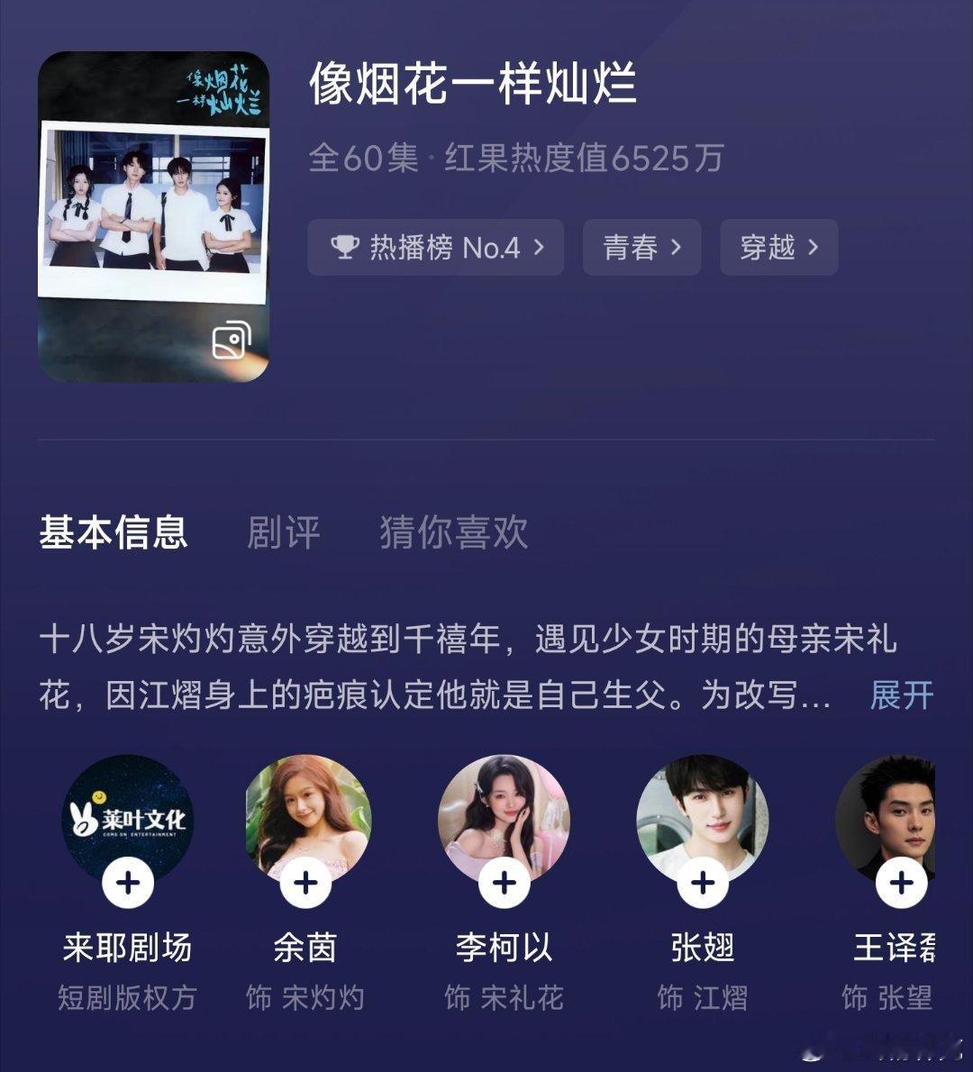 余茵、李柯以、张翅、王译磊主演的像烟花一样灿烂是不是短国近期最扑头部剧