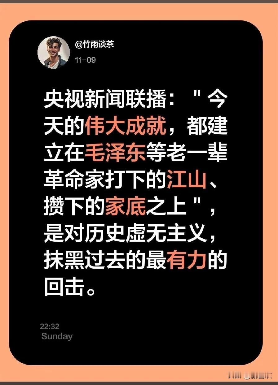 刷到新闻联播的开场白太直击人心了!直接点透幸福生活的根源, 哪有什么凭空而来的好日子,全是 革命先辈用血汗筑牢的根基。 总有人觉得日子过得好全靠自己本事,却忘了高楼万丈离不开坚实地基。 毛主席那代人抛头颅洒热血打江山, 才换来如今的太平盛世, 这份恩情绝不能忘。 忘记先辈的付出,就是丢了根、忘了本,最终只会变得浮躁自私。 毛泽东思想是我们的精神底气, 唯有铭记历史、传承先辈精神, 中国才能长盛不衰。 和平年代的年轻人没经历过战乱贫困,更该主动走进历史, 从先辈精神中汲取力量。 铭记历史从不是空谈, 而是刻在骨子里的感恩与担当。 你觉得哪些方式能让年轻人更好传承这份精神?