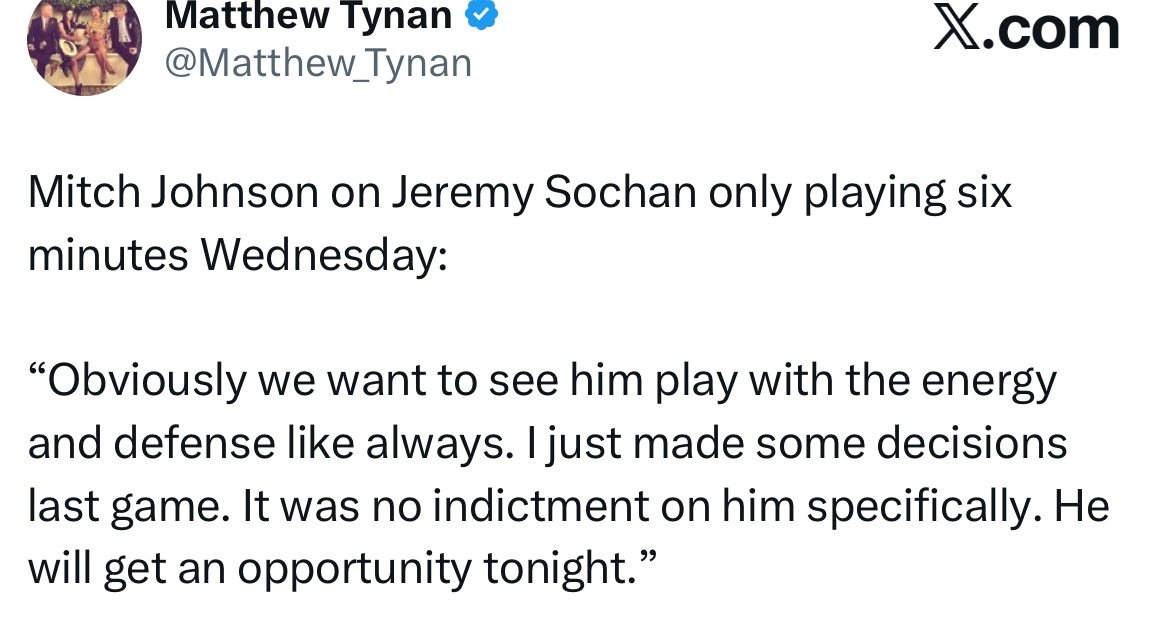 米奇-约翰逊谈索汉上一场仅六分钟出战时间:“显然,我们希望他能像往常一样充满活力地比赛,并做好防守。上一场比赛我只是临场做了一些决定,这并不是针对他个人。他今晚会得到机会。” | |