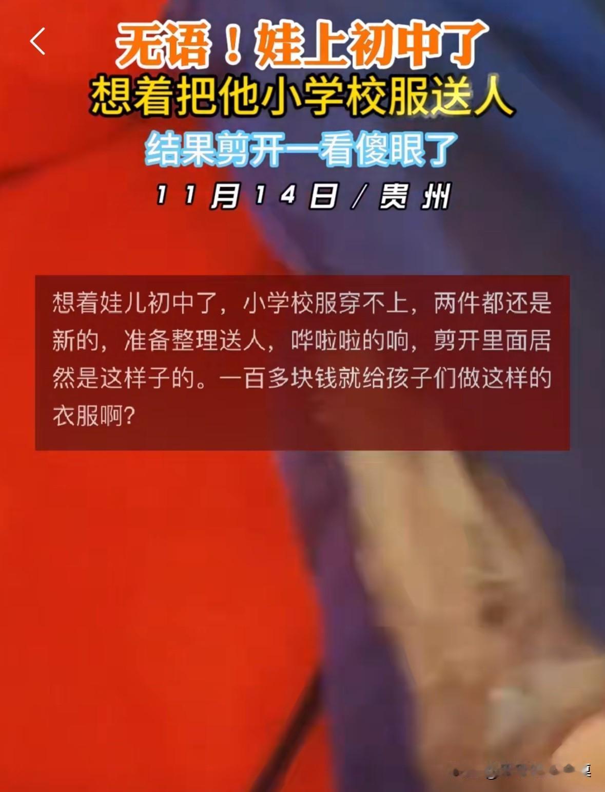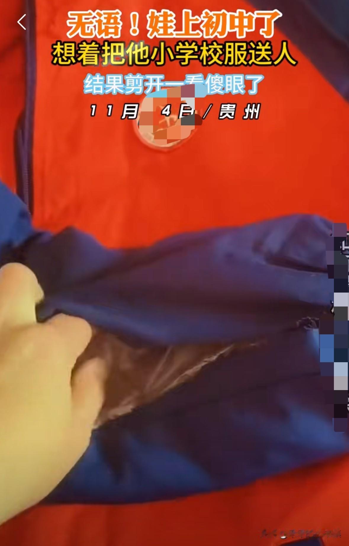 孩子上初中了,准备把他小学的校服送人,没想到一剪开里面是一层塑料布,整个人懵了。 现在的廉价衣服,基本上都是聚酯纤维(塑料做的)。 一年几千块的学校,你想穿好校服那是不可能的,学校也要赚钱啊。除非你上私立贵族学校,衣服料子肯定好。 只要钱花到位,什么都是好的。小孩校服