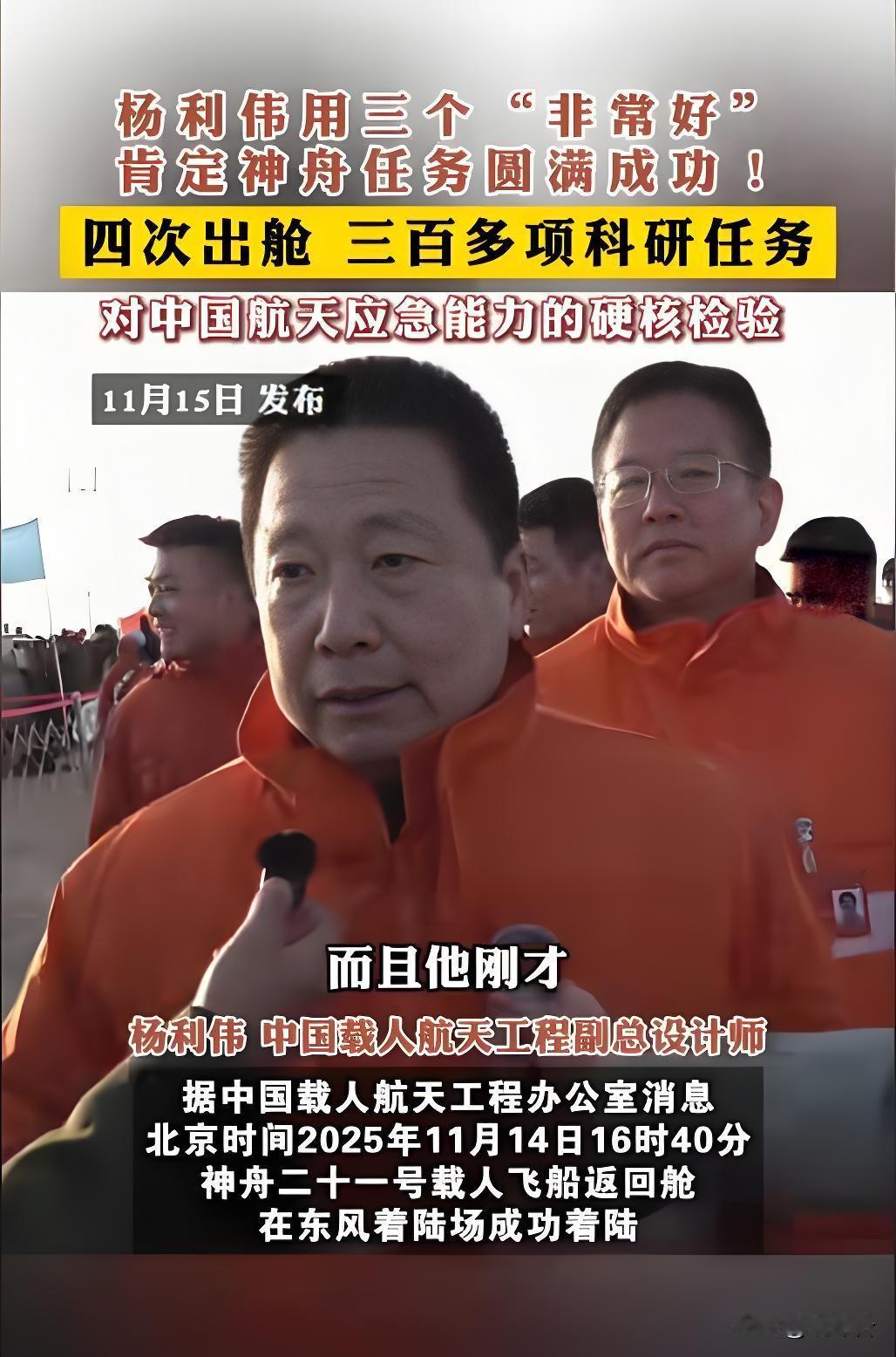 回家了!神舟二十一号三位航天员安全着陆东风草原 11月14日,神舟二十一号载人飞船返回舱在东风着陆场成功着陆,航天员陈冬、陈中瑞、王杰身体状态良好,标志着此次飞行任务取得圆满成功。每一次成功返回,都是中国航天稳扎稳打、迈向深空的坚实一步。神舟二十一号的任务圆满成功,不仅是对航天员专业素养和地面支持团队协同作战能力的一次完美检验,更是我国载人航天工程成熟性与可靠性的又一次有力证明。在欢呼英雄凯旋的同时,我们更应看到其背后庞大的产业链支撑和无数科技工作者的默默付出。从“一人一天”到“多人多月”,从舱内活动到太空行走,中国航天正以令人惊叹的速度不断刷新纪录。此次任务的成功,为后续的空间站常态化运营、深空探测乃至载人登月奠定了更坚实的基础。星辰大海的征途,是永无止境的创新之路,也需要社会公众持续的关注与支持,让航天精神激励更多年轻人投身科学探索。