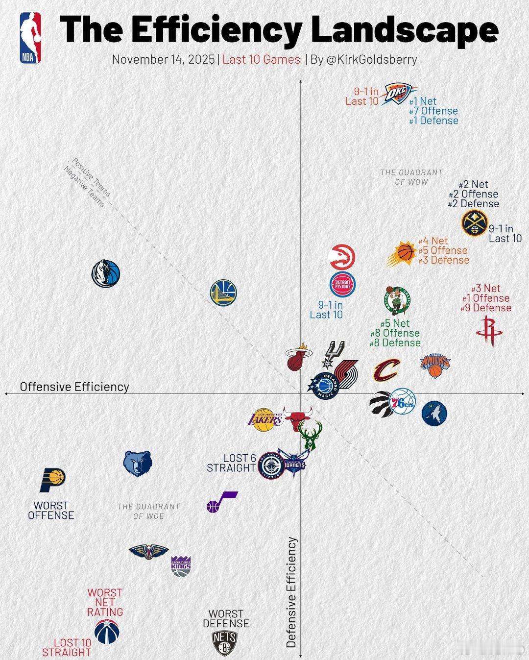 截至目前最近10场的效率分布👀纵轴是防守效率,横轴是进攻效率
