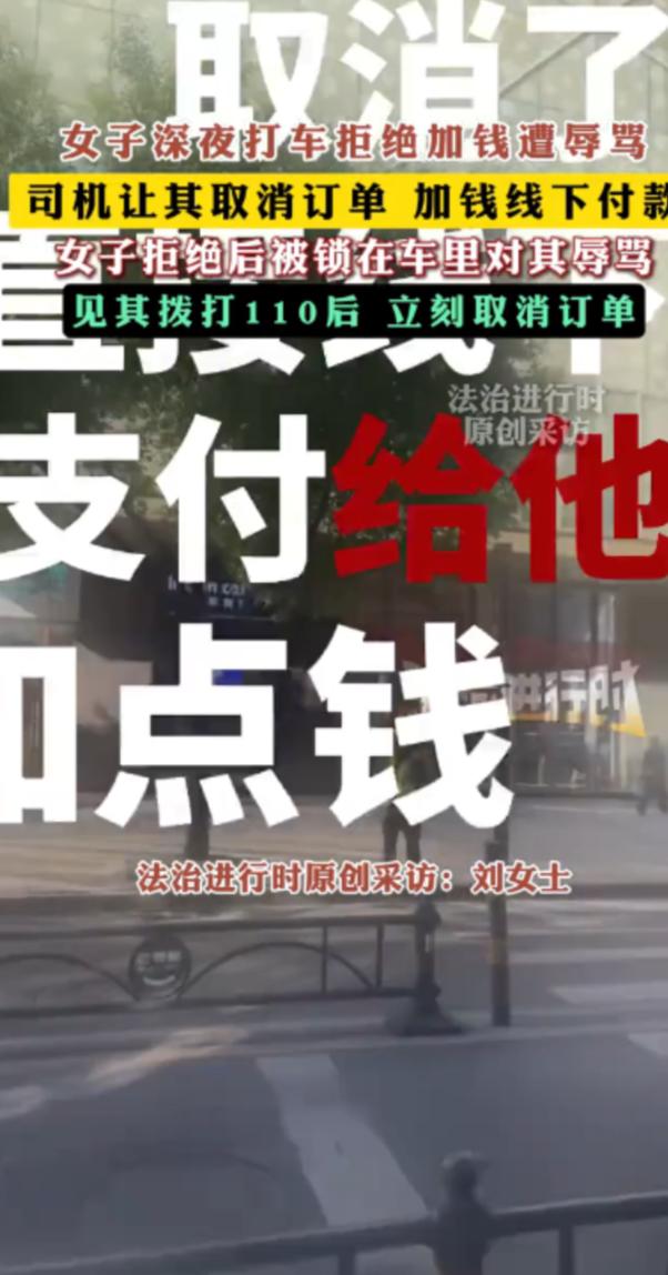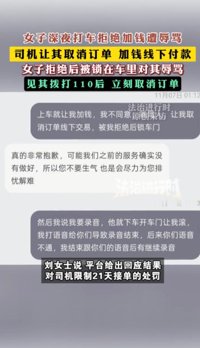 “必须严惩!”11月7日,湖北武汉,一女子凌晨1点打网约车,结果刚上车,司机就表示这单不划算,能不能加点钱?女子拒绝后,司机竟将车门锁死,在车里对着她辱骂!女子见状立即报警,司机这才开门让她下去。网友:太嚣张了! 11 月 7 日凌晨 1 点,湖北武汉的街头已经寒意刺骨,刚结束景区游玩的刘女士,拖着疲惫的身子打开手机叫了辆网约车,忙活了一天她就想快点回到温暖的家,好好休息一下,可万万没料到这趟本该顺利的行程,却变成了一场被困在密闭车厢里的噩梦。 车子稳稳停在路边,刘女士拉开车门坐了上去,刚系好安全带,司机就开口了,语气带着点不耐烦:“姑娘,你这单路程不算远,深夜跑一趟不划算,要不你把平台订单取消了,私下转我加点钱我再送你回去?” 刘女士一听就愣住了,心里立马泛起了嘀咕,网约车不就是明码标价的吗?下单的时候多少钱就是多少钱,怎么还能临时加价呢?这跟以前出租车宰客有啥区别?她当即就拒绝了司机的要求,觉得司机既然接了单,就该按平台规矩来,不能随便坐地起价。 可谁知道就是这一声拒绝,直接点燃了司机的怒火。,司机脸上的表情瞬间变了,没再多说一句废话,反手就按下了车门锁。 “咔哒” 几声,所有车门都被锁死,刘女士下意识地想拉车门,却发现怎么也打不开,那一刻这辆小小的网约车不再是方便的交通工具,反而成了一个移动的 “牢笼”,把她和一个情绪失控的陌生人困在了一起。 紧接着司机就开始对着刘女士破口大骂,那些话难听又刺耳不堪入耳,凌晨时分街头本就人迹罕至,车厢里只有司机的辱骂声,气氛压抑得让人窒息。 刘女士是个独自出行的女性,面对这样的场面,恐惧瞬间席卷了全身,手脚都开始发抖。她心里只有一个念头,必须赶紧自救! 她强忍着恐惧,颤抖着摸出手机,手指都有些不听使唤,好不容易才找到报警电话,刚要按下拨号键,司机大概是瞥见了她的动作,又或许是听到了她嘴里念叨的 “报警” 两个字,瞬间怂了。 原本紧锁的车门 “咔哒” 一声解锁了,司机也停下了辱骂,脸色难看地单方面取消了订单,冷冰冰地甩下一句 “你下去”,就把惊魂未定的刘女士赶下了车。 被丢在路边的刘女士,站在寒风里好半天都没缓过神来,心脏还在砰砰狂跳,刚才的恐惧就像阴影一样挥之不去,缓过劲后她第一时间报了警,向警方说明了事情的来龙去脉,同时也联系了网约车平台,要求平台给个合理的说法,严惩这个嚣张的司机。 没过多久平台给出了处理结果:涉事司机暂停接单 21 天,看到这个结果,刘女士心里满是失望,网友们更是炸开了锅,纷纷怒喊 “必须严惩!”“这惩罚也太轻了吧!” 大家都觉得,司机的行为已经不仅仅是坐地起价了,锁车门限制人身自由、言语辱骂,这已经涉嫌违法了,21 天的处罚简直就是隔靴搔痒,根本起不到任何震慑作用。 有网友说:“深夜独行的女性本来就缺乏安全感,这个司机明知道对方是单身女生,还敢这么嚣张,就是笃定惩罚不重,才敢为所欲为!” 还有人吐槽:“平台这是在和稀泥吗?21 天之后司机照样能接单,谁能保证他不会再犯?到时候又会是谁遭殃?” 说实话咱们平时打网约车,图的就是个方便、安全,可武汉这起事件,真的让大家心里的安全感碎了一地,平台一直宣传所谓的 “安全闭环”,什么车内录音录像、一键报警,可真遇到危险的时候,这些功能似乎都没能及时发挥作用,刘女士被锁在车里的那一刻,录音录像能帮她解锁车门吗?能阻止司机辱骂吗?显然不能。 更让人寒心的是平台的处理态度,21 天的暂停接单,看似有处罚实则根本没触及核心,司机敢这么铤而走险,一方面是觉得深夜接单不划算,想多赚点钱,另一方面也是摸准了平台的处罚力度,觉得就算被投诉,也没什么大不了的。 可他们忘了乘客的安全才是第一位的,这种漠视他人安全、肆意妄为的行为,就该受到重罚,甚至永久封禁,不能再让他们有机会危害其他乘客。 平台不能只想着赚钱,更要承担起应有的责任。所谓的安全承诺不能只是一句空话,要真正落实到行动上,完善处罚机制,加大对违规司机的惩戒力度,让那些心存侥幸的司机不敢轻易越界。 (信息来源:《女子深夜打车拒绝加钱遭辱骂 司机让其取消订单 加钱线下付款女子拒绝后被锁在车里对其辱骂见其拨打110后 立刻取消订单》法治进行时)