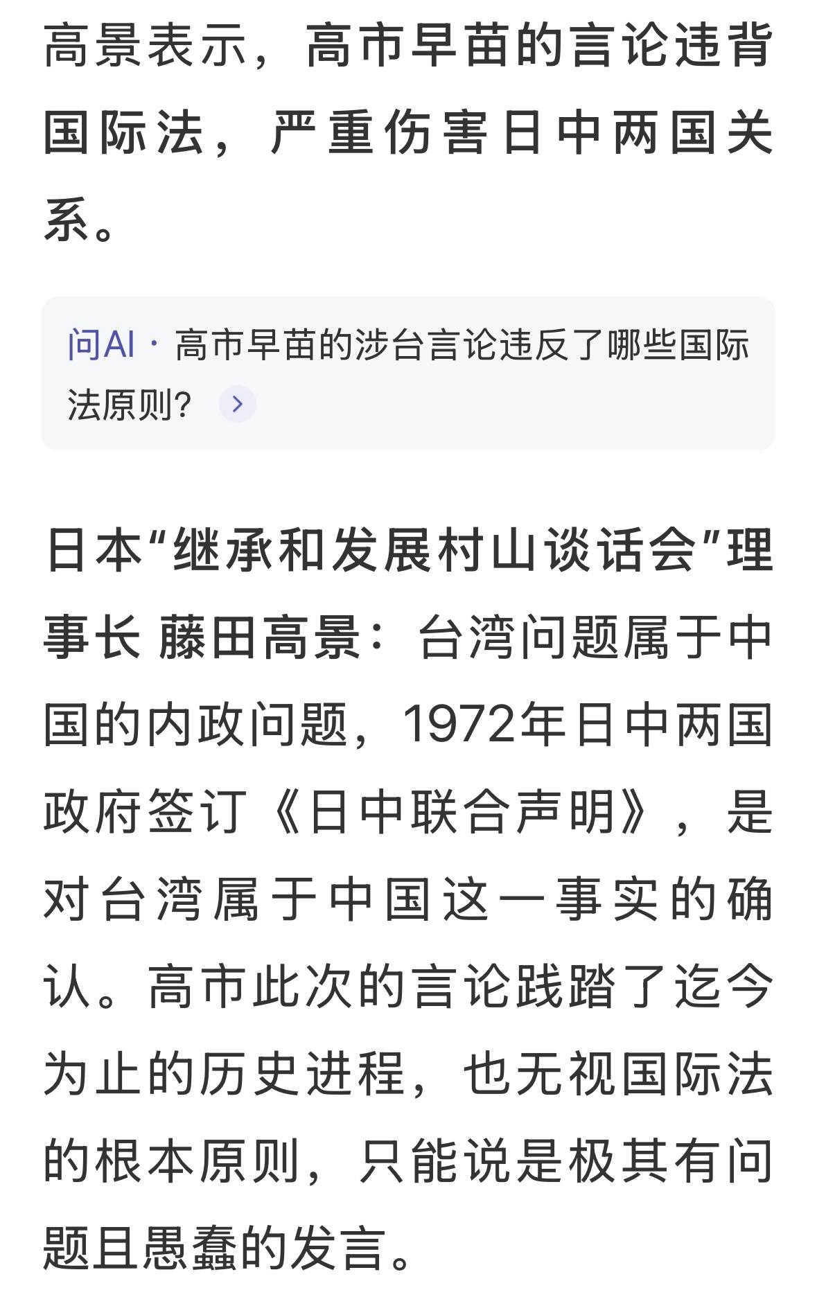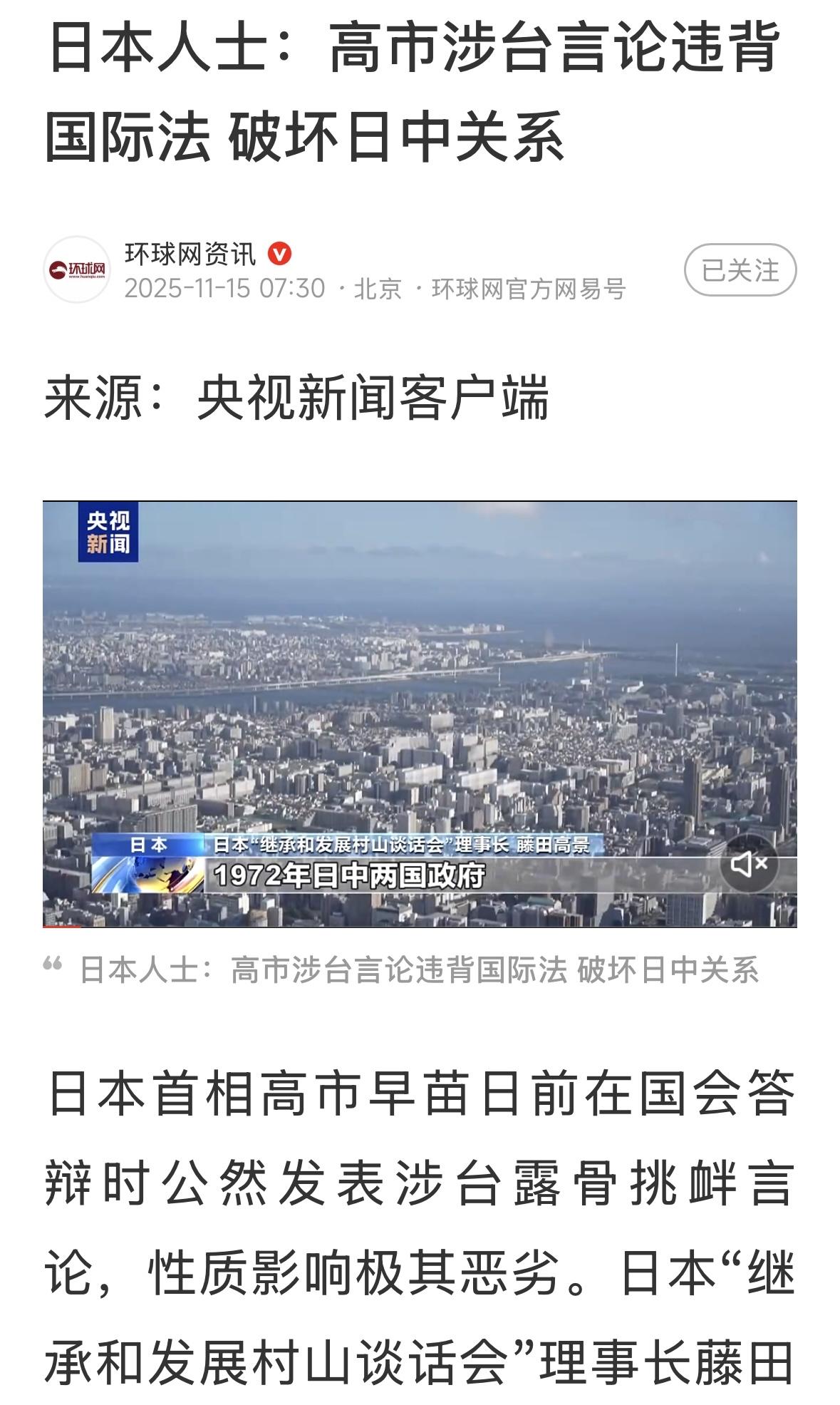 高市早苗的错误是,对台湾问题说三道四,干涉中国内政,这违背了中国处理台湾问题的基本原则,高市早苗言论的严重性是,不但说三道四,还要武力干涉,这就触犯了中国人的敏感神经,违背了国际基本法原则,也违反了日本宪法的规定。高市早苗态度傲慢,执迷不悟,不思悔改,必将自食其果,绝没有好下场!