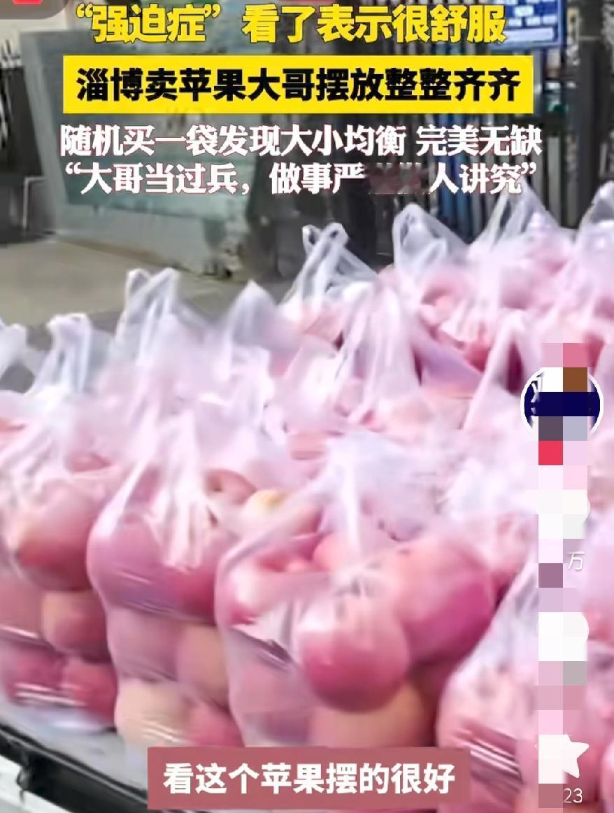 练兵都知道 练苹果倒是头一次见 淄博卖苹果的大哥,真的把“强迫症式摆摊”玩明白了!要是我肯定会买一袋。 远远看去,那车苹果,一袋袋码得横平竖直,随便拎一袋都是大小均匀、没疤没烂,大小均匀。 有人说他当过兵,做事自带严谨劲儿,也有人说这是强迫症,这哪是卖水果?这是真讲究人啊。 现在好多生意总想着差不多就行,还抱怨生意不好,如果你能像这个大哥一样,多点儿创意,这不生意就来了? 其实大家爱买他的果,不只是瞅着舒服,更是信他这份真实,连摆摊都这么上心,东西能差到哪去? 你说,要是咱们做事都有这股“较真劲”,是不是啥事儿都能成?果农苹果摆路中 拦车卖苹果 卖苹果的大姨 苹果