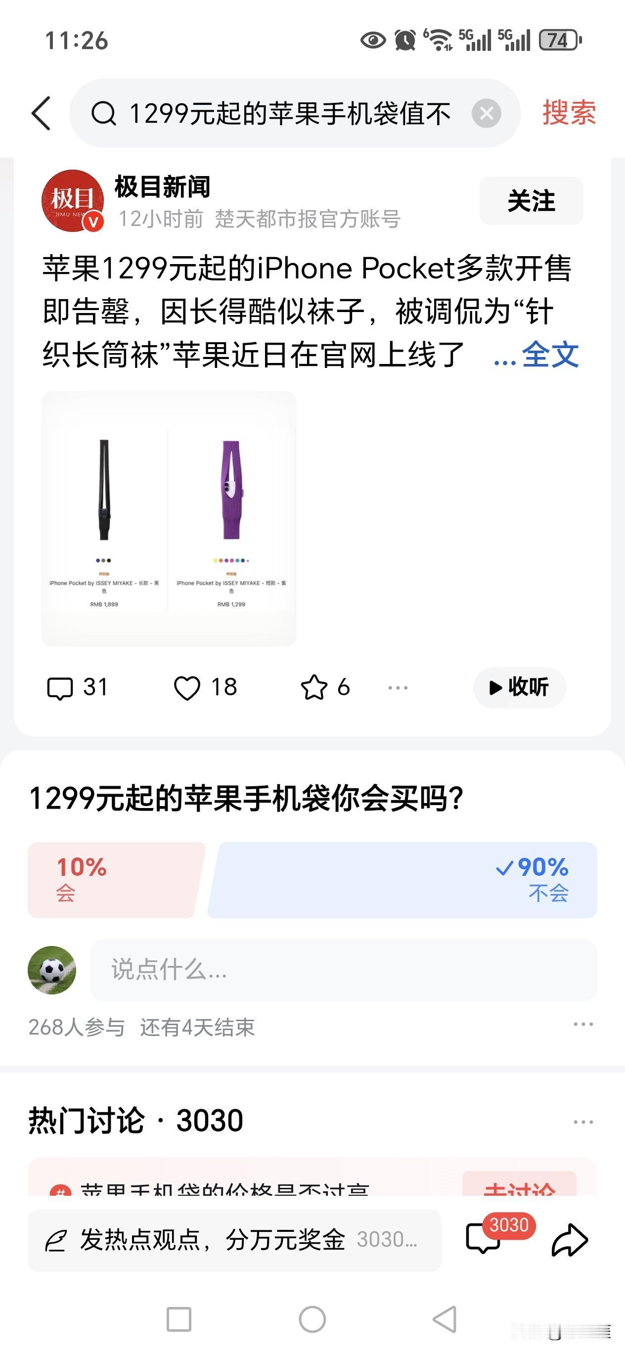 最近苹果推出了一款苹果手机袋,价格1299元起,大家猜猜这么贵的价格能不能卖出去??? 我们的第一直觉是,这个逆天的价格,能卖出去一个算苹果赢。 结果你猜怎么着?上线第一波产品瞬间就被抢光,我的天,现在的人都这么有钱的吗?这么贵的价格还真有人买啊? 看看下面的投票,竟然有10%的人愿意买,这些人到底怎么想的?难道他们不知道苹果在割韭菜吗?真搞不懂!