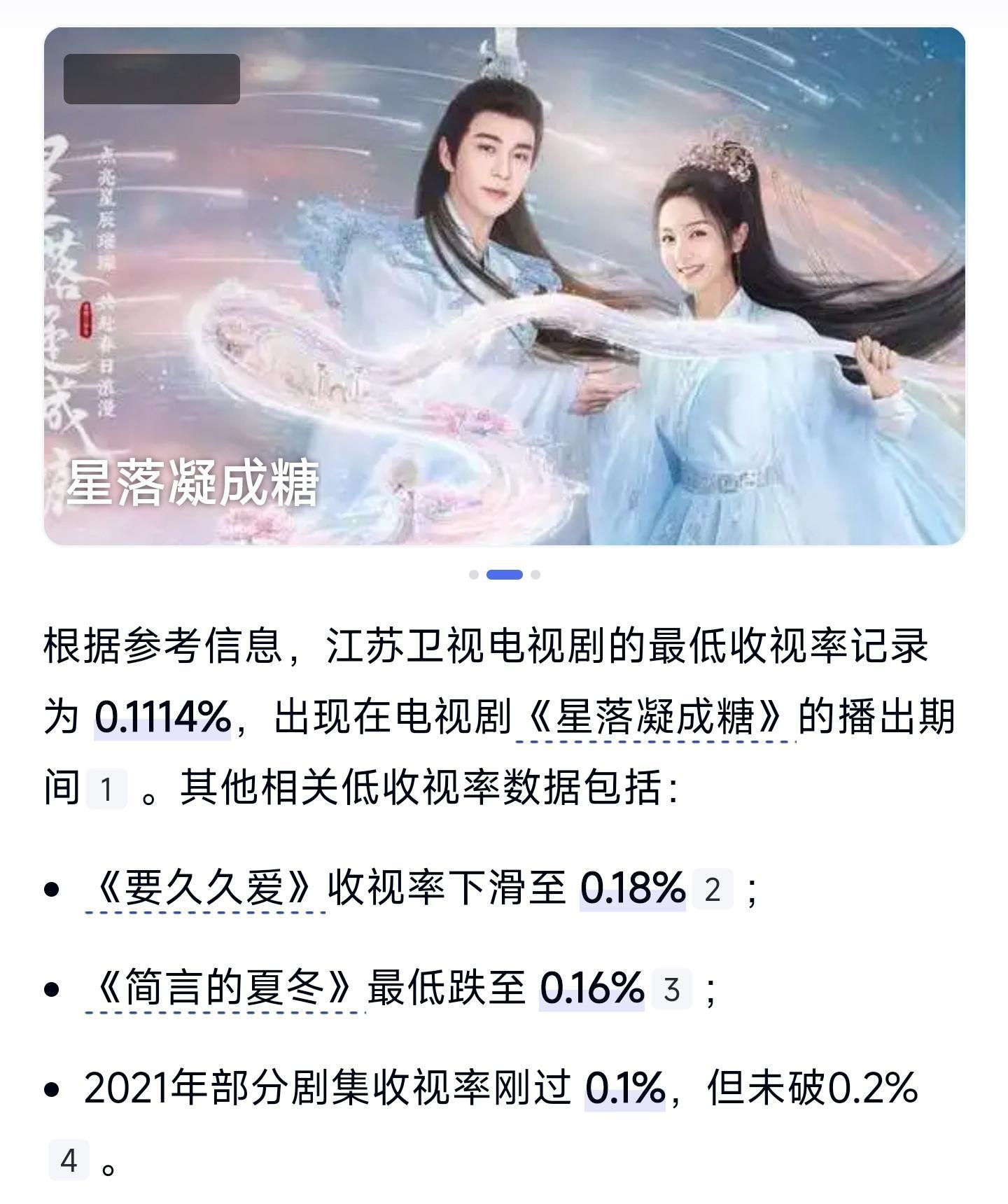 其实任嘉伦演技挺好的,咋这么不扛剧呢?别人都是破2,他的收视率破0.2。根据参考信息,江苏卫视电视剧的最低收视率记录为 0.1114%,出现在陈星旭,李兰迪主演的电视剧《星落凝成糖》的播出期间。其他相关低收视率数据包括:❶杨紫,范丞丞《要久久爱》收视率下滑至 0.18%。❷朱亚文,万茜主演的《简言的夏冬》最低跌至 0.16%。