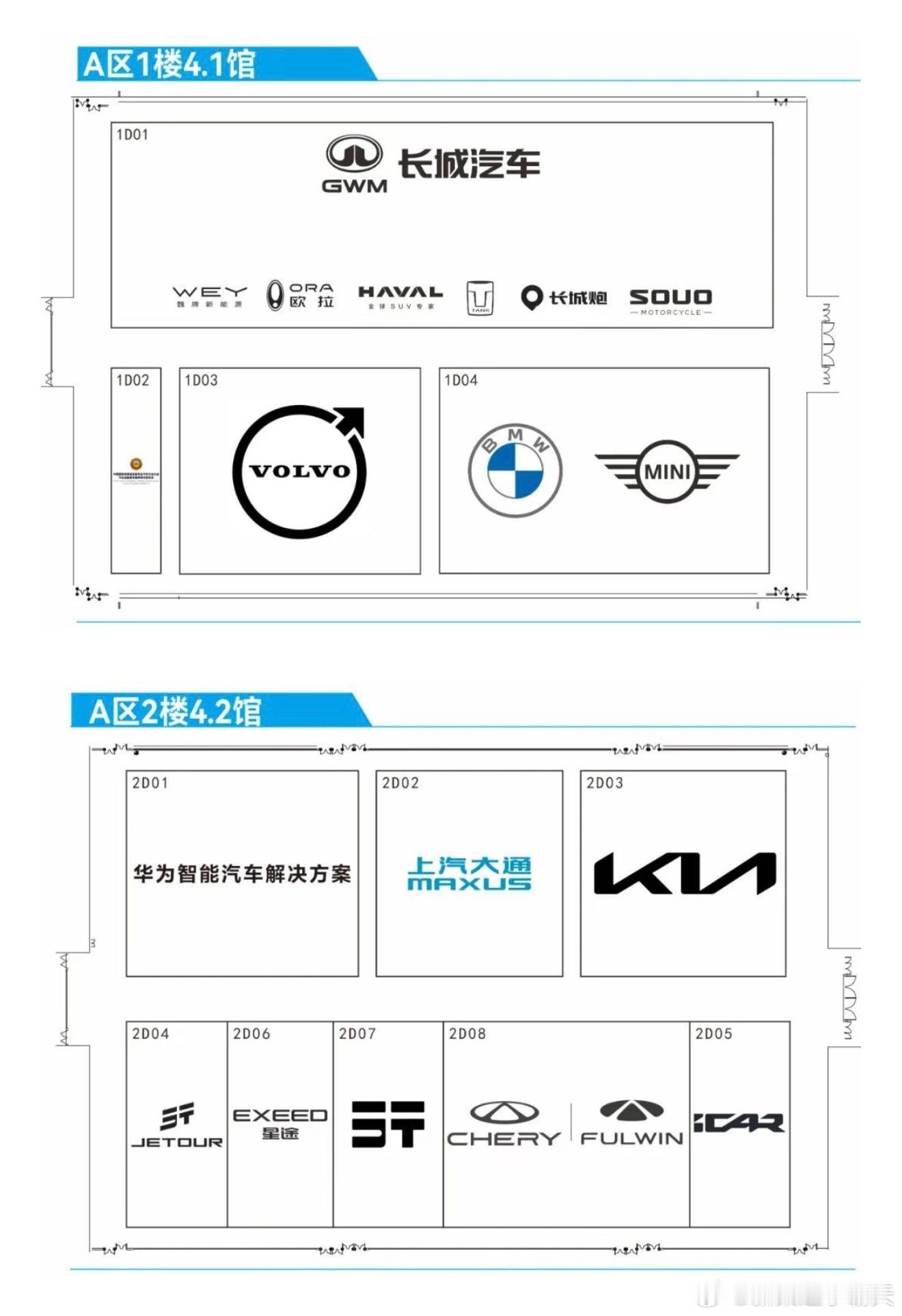 广州车展展位图出来了~有几个馆有点意思:- A 区5.1&5.2:一楼是北汽(包括享界)、奔驰,二楼是问界(图4)- D 区17.2 :智界夹在小米和小鹏中间,对面有乐道(图5)- D 区18.2:鸿蒙智行旁边就是宁德时代(图5)- D 区19.2:理想旁边是零跑(图5)你们比较期待那几个馆?