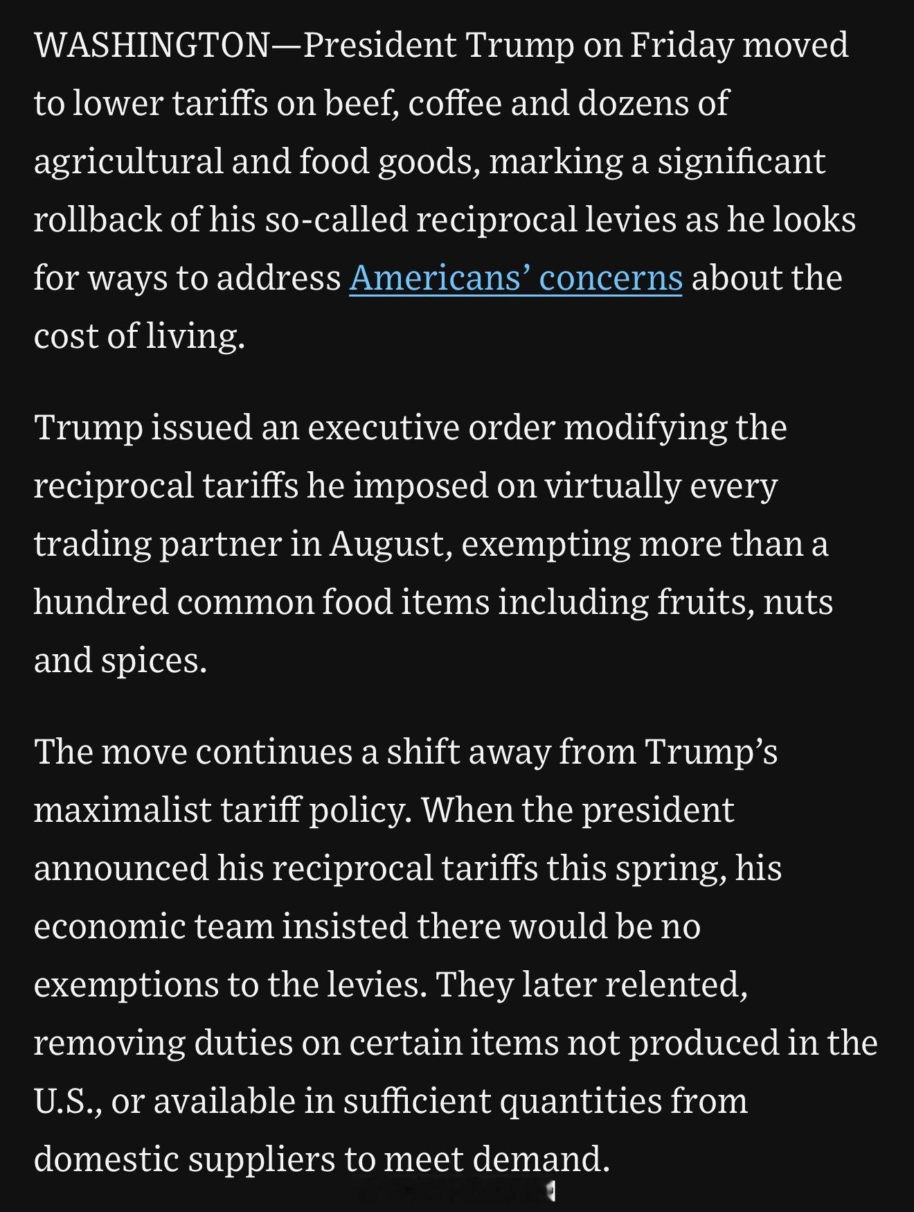 白宫今天宣布大幅取消食品关税:某些农产品将不再受到对等关税的影响。其中包括:咖啡和茶、热带水果及果汁、可可和香料、香蕉、橙子和番茄、牛肉,以及部分化肥。
