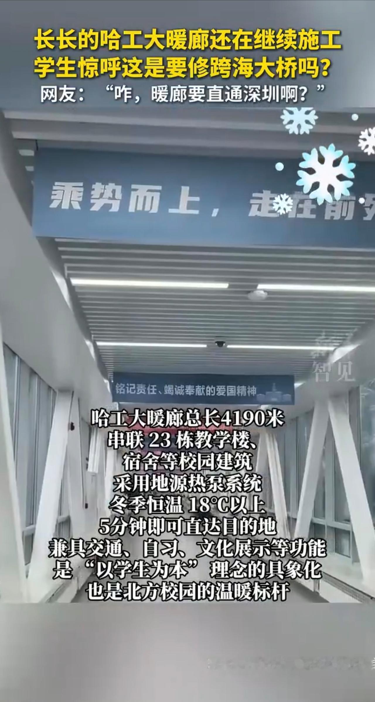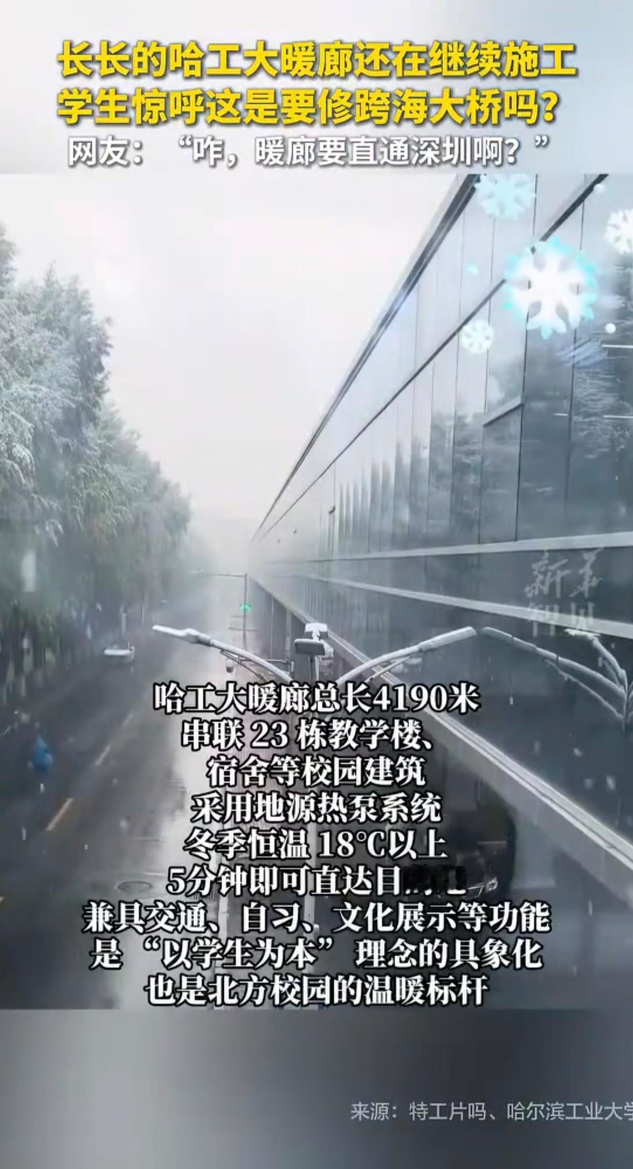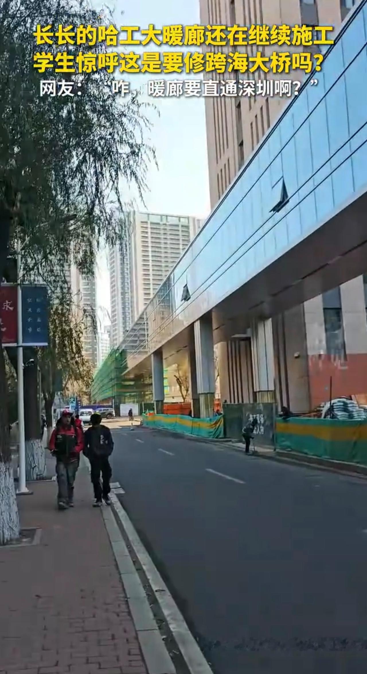 |长长的哈工大暖廊还在继续施工,学生惊呼这是要修跨海大桥吗?网友:“咋,暖廊要直通深圳啊?”