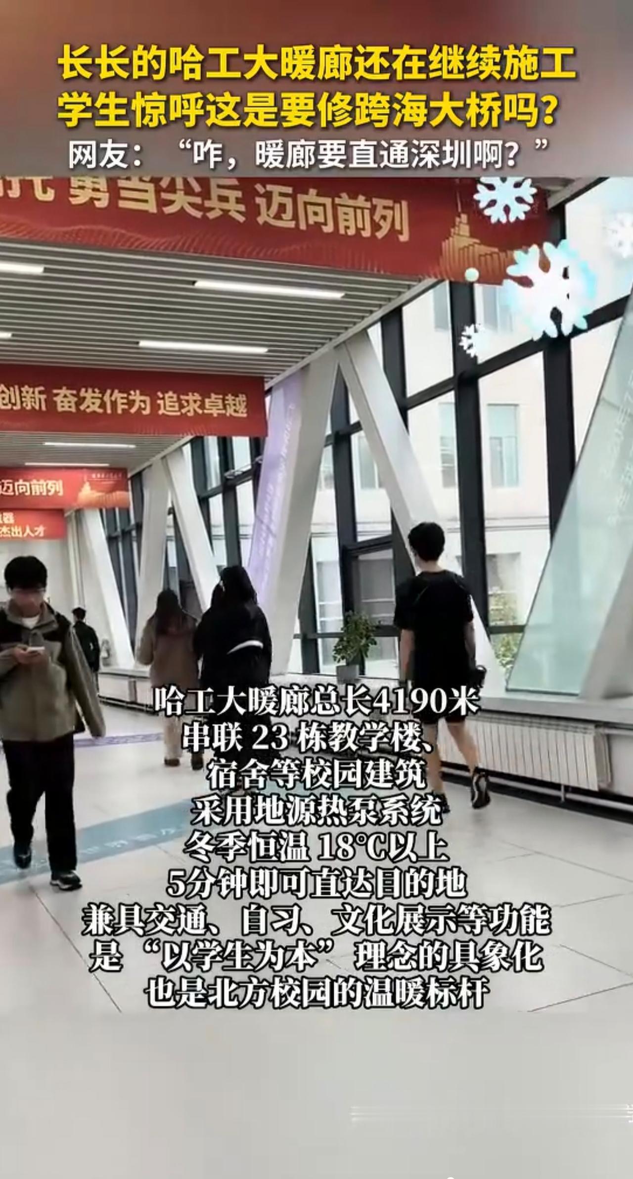 |长长的哈工大暖廊还在继续施工,学生惊呼这是要修跨海大桥吗?网友:“咋,暖廊要直