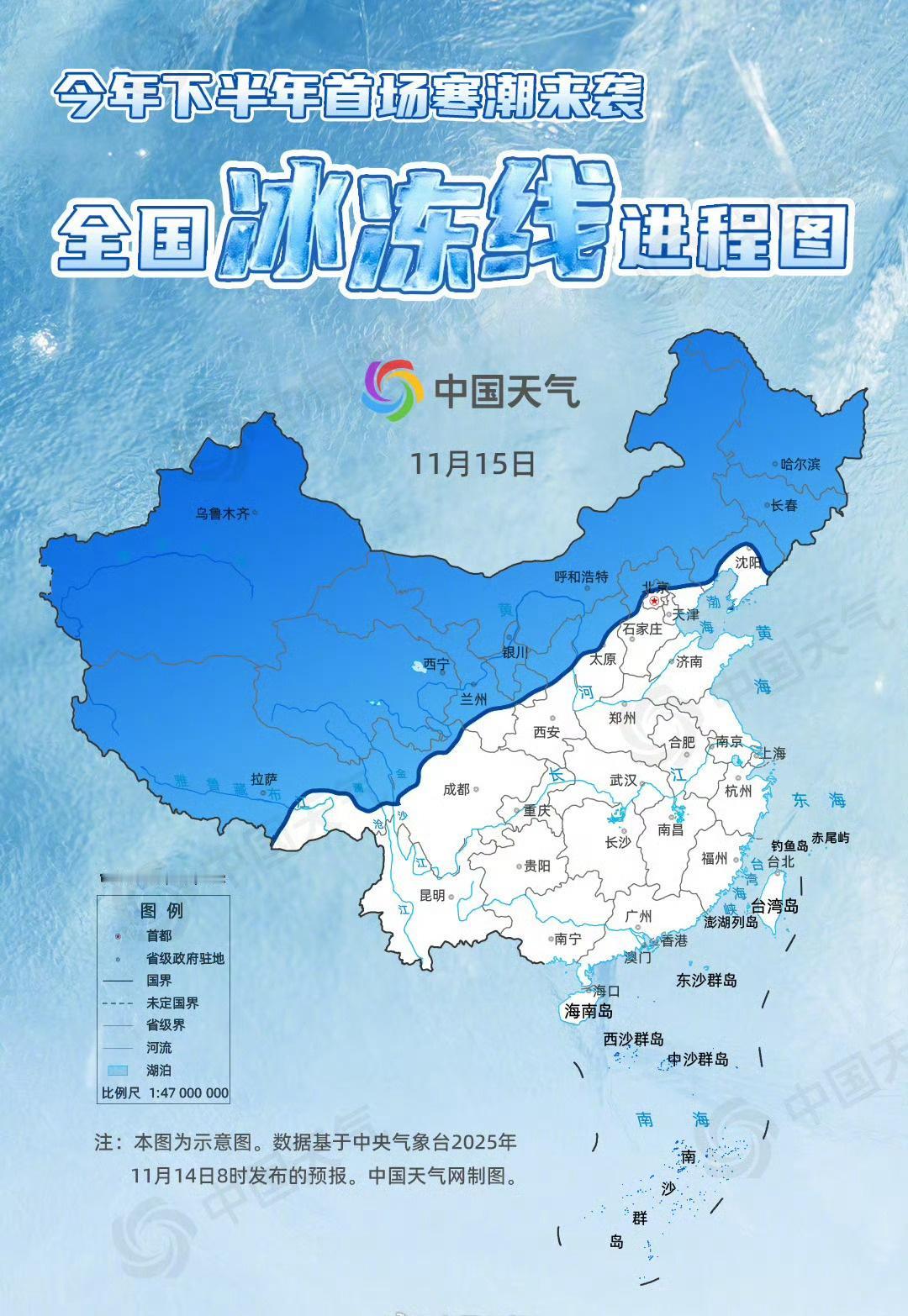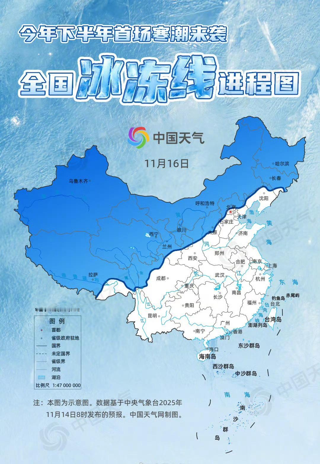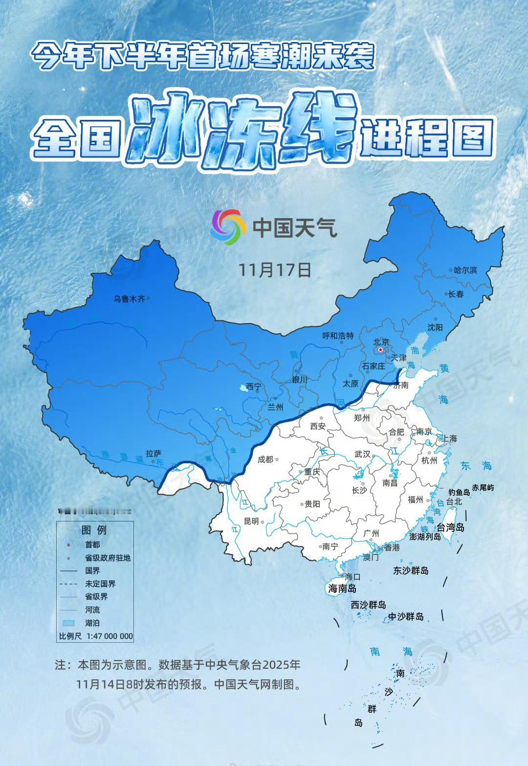 【下半年首场寒潮来袭全国冰冻线进程图上线】11月14日至17日,今年下半年首场