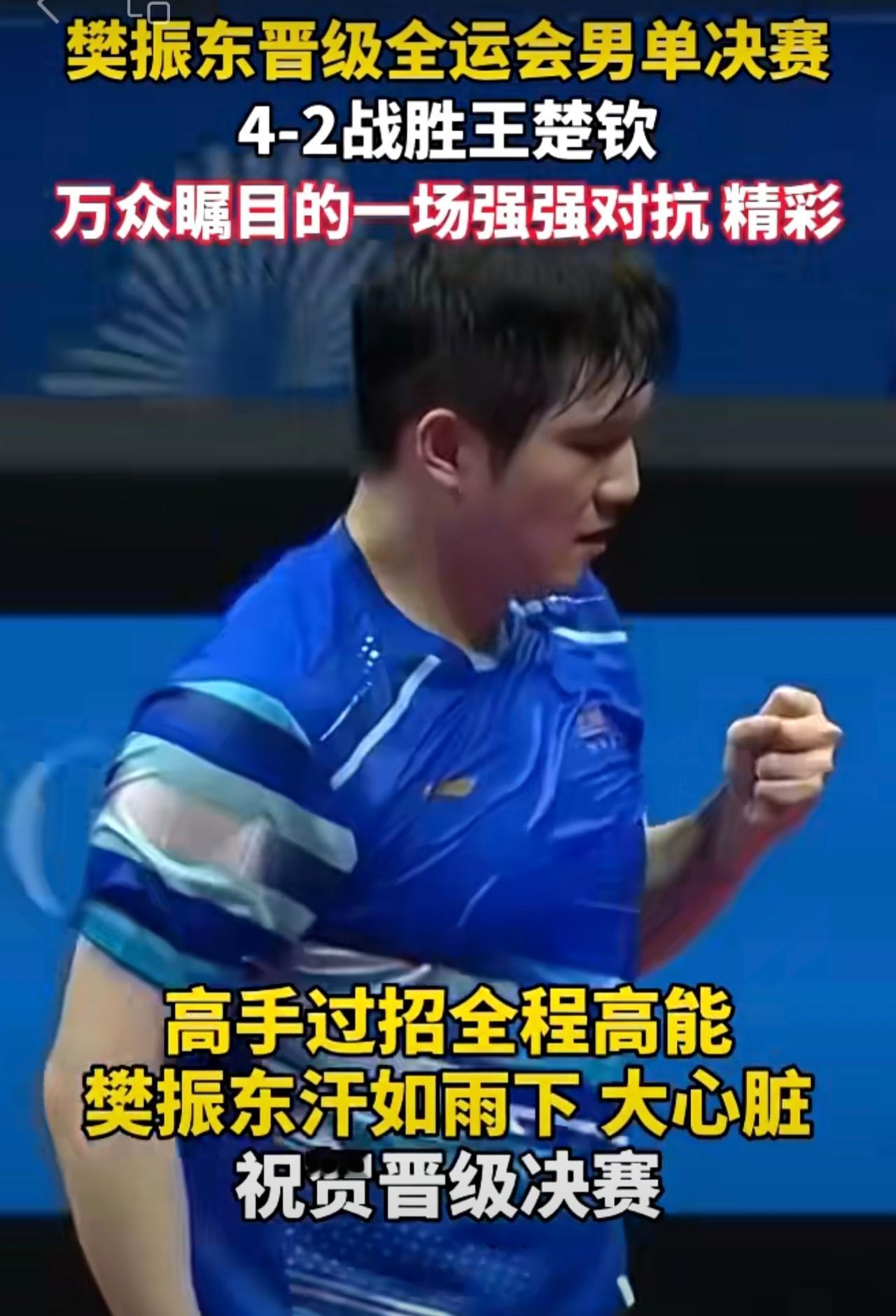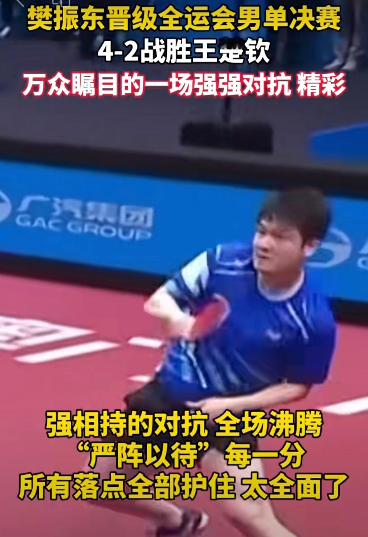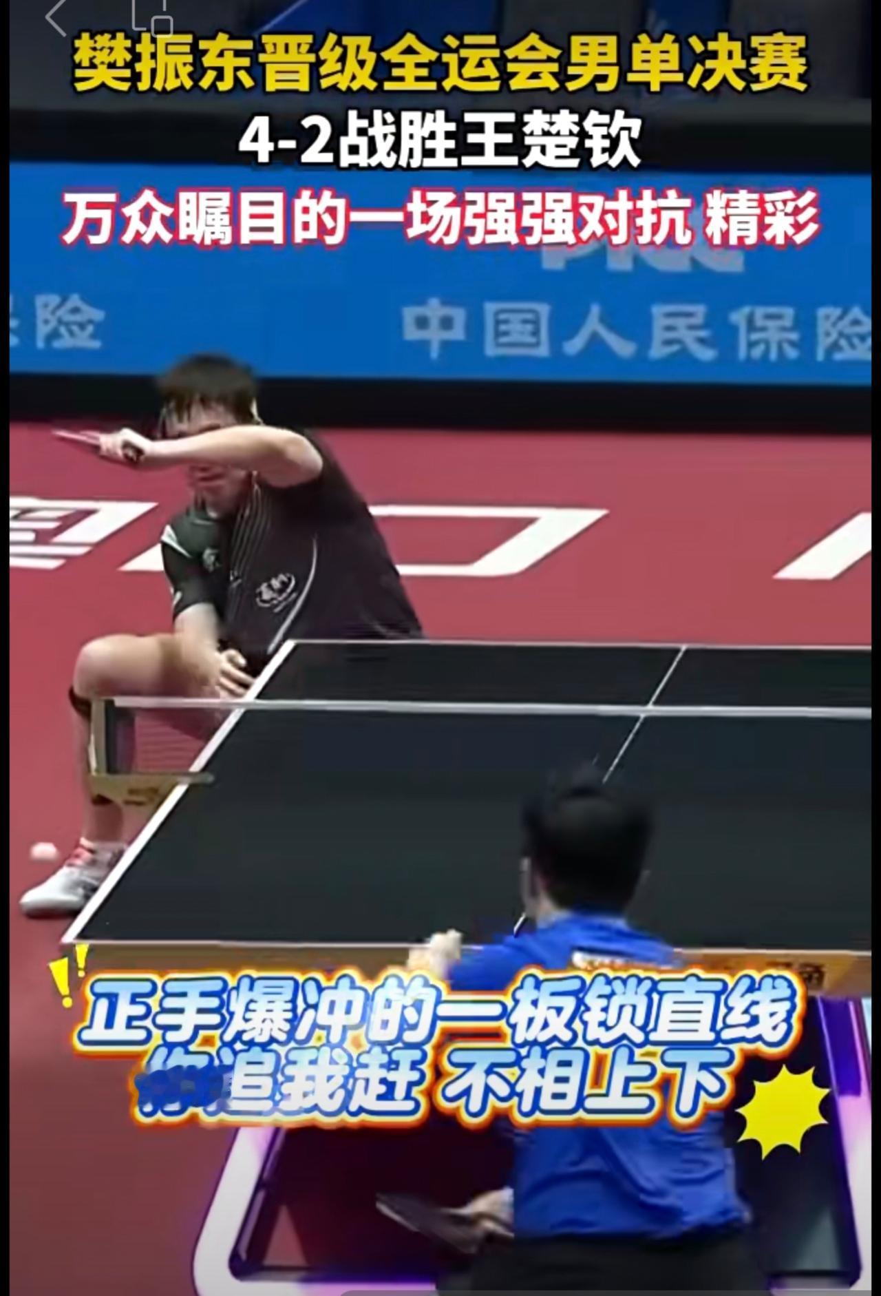 樊振东王者归来 4-2战胜王楚钦! 晋级全运会男单决赛! 万众瞩目的一场强强对抗! 中生代领袖对阵新生代领军的激励碰撞, 热闹欢呼声响彻全场。
