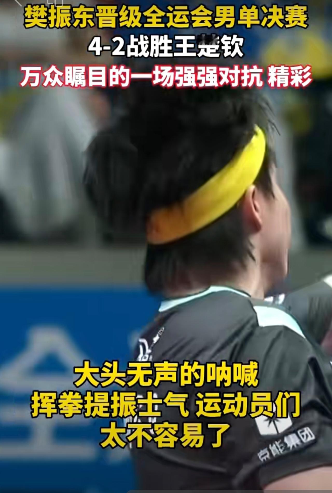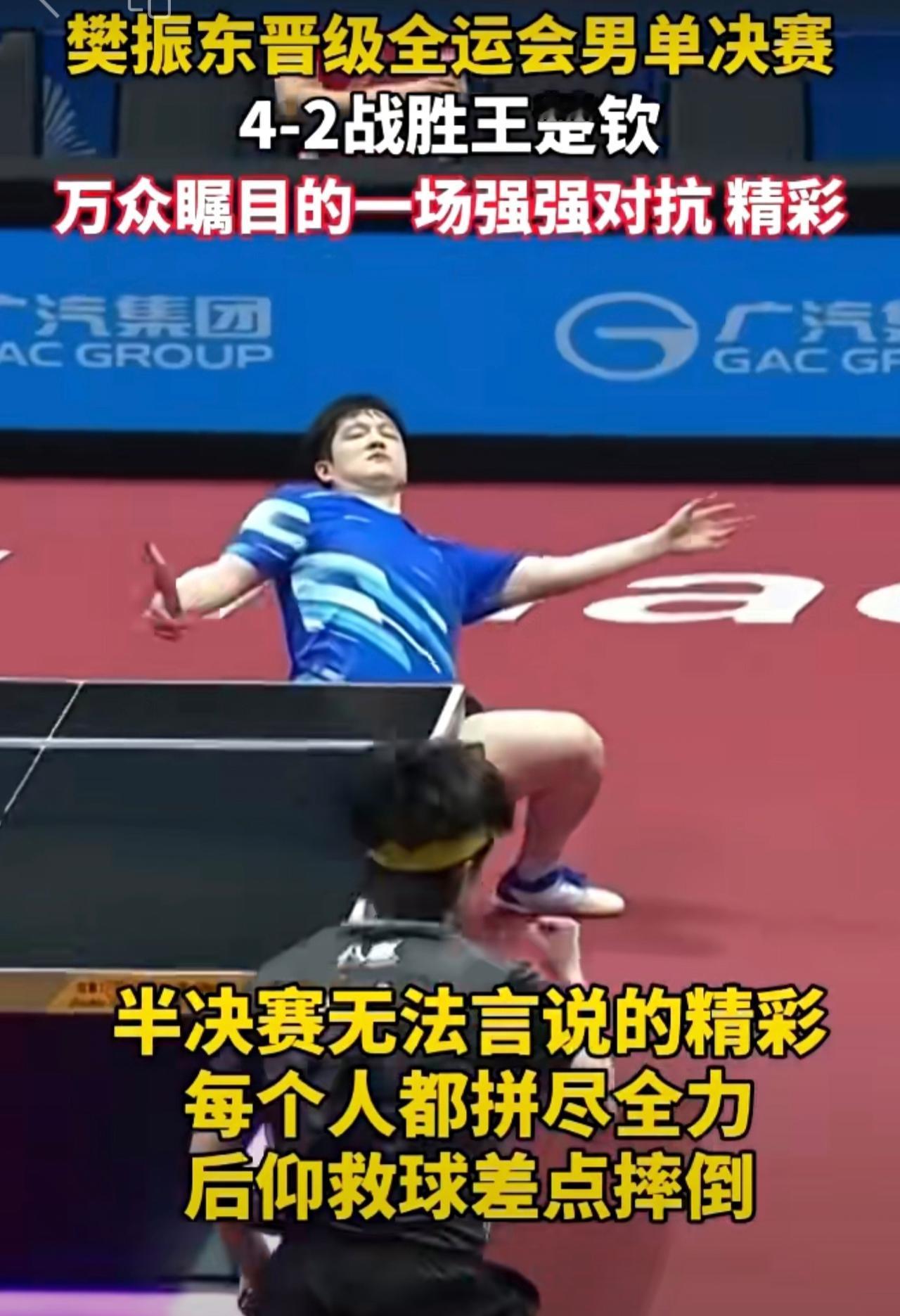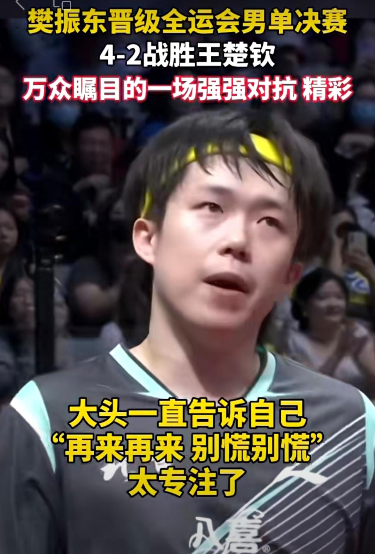樊振东王者归来 4-2战胜王楚钦! 晋级全运会男单决赛! 万众瞩目的一场强强对抗! 中生代领袖对阵新生代领军的激励碰撞, 热闹欢呼声响彻全场。