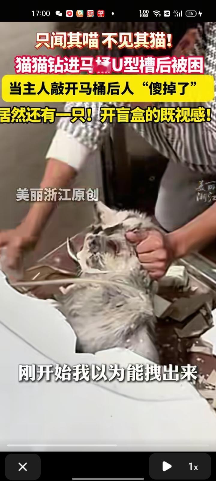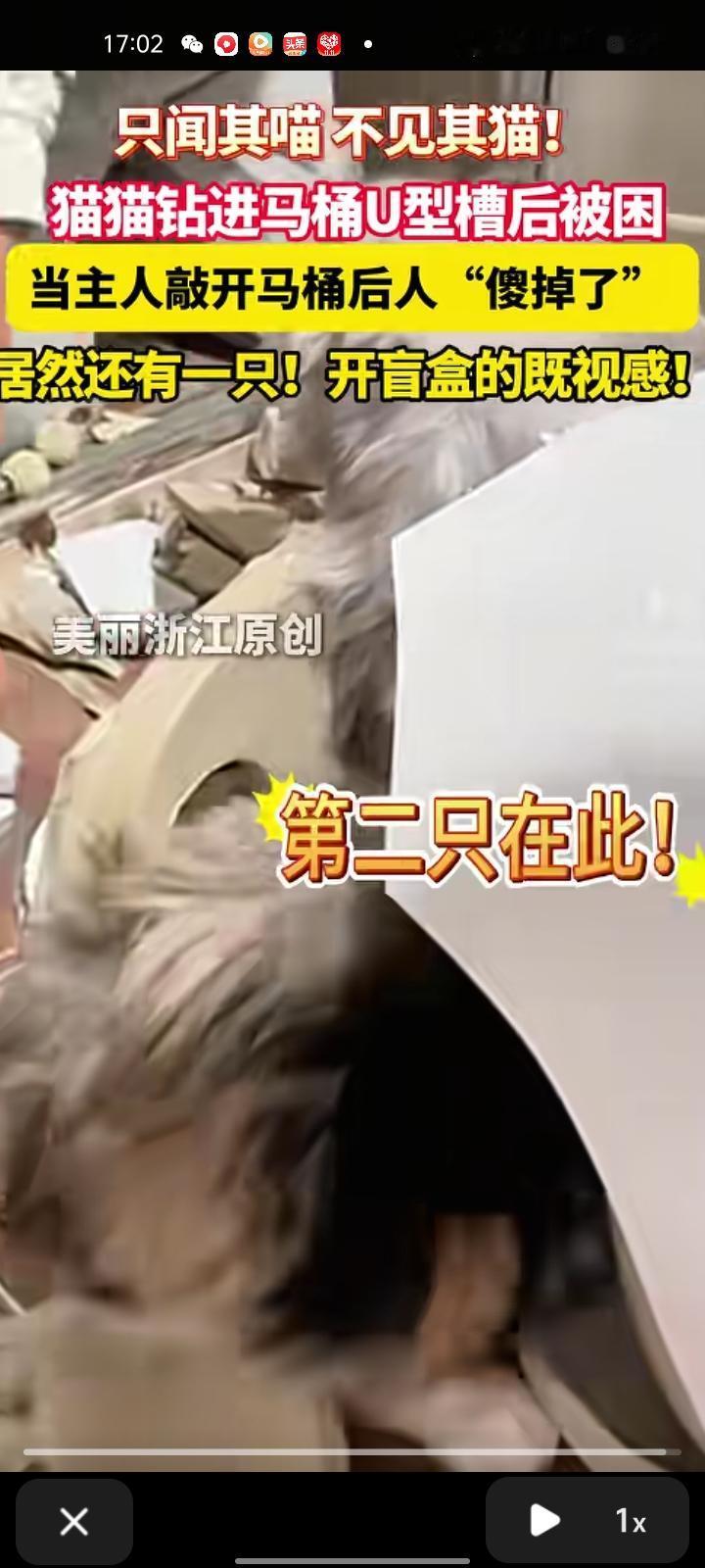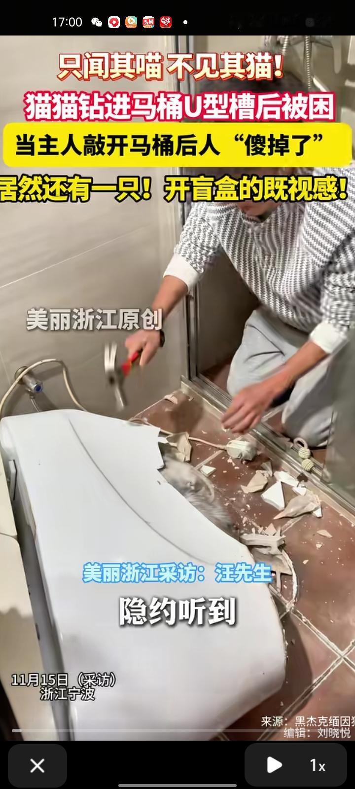 11月14日,浙江宁波。男子隐约听到卫生间传出猫叫声,走进卫生间,原来是猫卡在U型槽。当务之急,先敲碎马桶把猫救出来,结果猫体型太大拽不出,没想到里面卡了一只,这是一种开盲盒的既视感