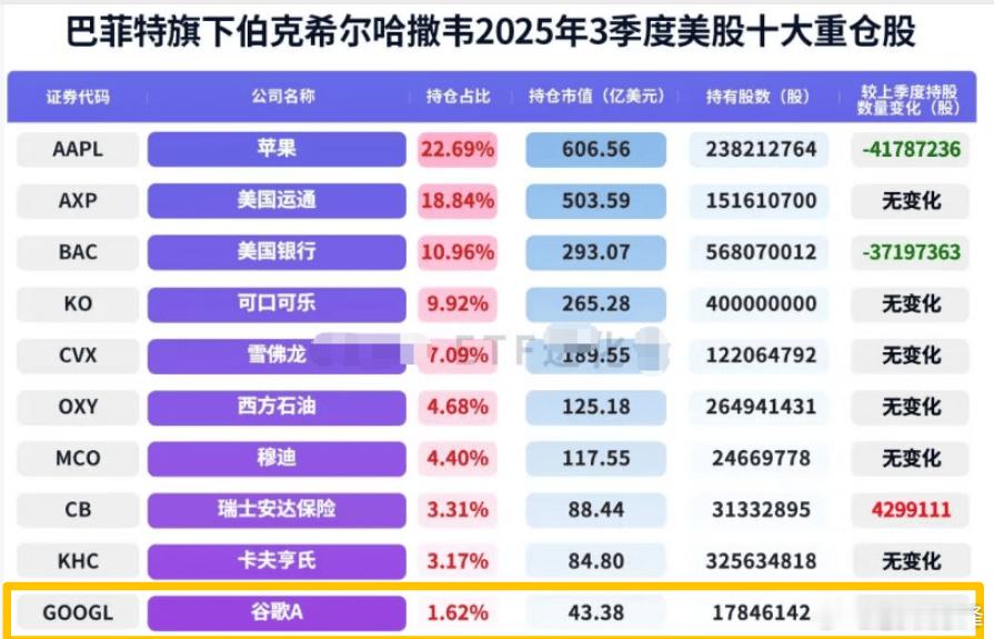 今天最大的新闻,巴菲特三季度抛售苹果,首次建仓谷歌。买入市值约43.4亿美元,成为伯克希尔的第十大重仓股!很多人第一反应是“为什么现在才买?”因为谷歌股价刚创历史新高,市值接近3.5万亿美元。这怎么有点像散户后知后觉去追高呢。但这就是巴菲特的风格,他追求确定性!老巴2016年买入苹果时,苹果不只是科技,而是护城河很深的消费品巨头。现在谷歌也一样,早已不是那个单纯依赖广告盈利的搜索公司,而是那个底层“核心AI平台”的巨头!谷歌在2025年的位置,与苹果2016年惊人相似。2016年苹果已经是全球第一市值的公司,但巴菲特买入后又赚了几倍!现在谷歌已经涨幅巨大,但如果你认可AI黄金十年刚开始,未来巴菲特再赚几倍是有可能的。总之,老巴向AI时代正式点头了,他不是追AI热潮;而在押宝下一个十年的核心资产,认定谷歌是AI应用时代那个最大的赢家。从软银抛售英伟达投资OpenAI,再到巴菲特大手笔买入谷歌。说明AI投资方向变了,巨头们开始看好下游AI平台公司、算力+模型+数据等底层力量!刀锋说过一个逻辑:只有无法落地的东西才叫泡沫,AI显然不算。如果AI真的是大泡沫,东大为啥还在后面玩命追赶?国家还在疯狂加大投入算力基建?这逻辑显然是不通的。对A股来说,大科技整个11月都在挨打,周五更是被砸到怀疑人生。昨晚英伟达大涨,加上谷歌盘后大涨,今天求实杂志重要文章《因地制宜发展新质生产力》,这些都是利好!下周科技应该会迎来喘息的。昨晚我也说了,接下来1-2周,科技方向可能会有一个阶段性的机会。原因有两个,一是美股七姐妹杀一波后,很快会阶段性见底回升;二是在摩尔和沐曦上市前,科技股要带着双创板块来一波反攻,把场子热度搞起来!当然,科技回归主线有难度,所以我建议大家搞均衡布局。科技、新能源、消费白马、红利都配一点....!守住2025年的盈利,好不容易今年行情不错,不要最后亏回去了,当下控制回撤比赚钱更重要。今天最大的新闻,巴菲特三季度抛售苹果,首次建仓谷歌。买入市值约43.4亿美元,成为伯克希尔的第十大重仓股!很多人第一反应是“为什么现在才买?”因为谷歌股价刚创历史新高,市值接近3.5万亿美元。这怎么有点像散户后知后觉去追高呢。但这就是巴菲特的风格,他追求确定性!老巴2016年买入苹果时,苹果不只是科技,而是护城河很深的消费品巨头。现在谷歌也一样,早已不是那个单纯依赖广告盈利的搜索公司,而是那个底层“核心AI平台”的巨头!谷歌在2025年的位置,与苹果2016年惊人相似。2016年苹果已经是全球第一市值的公司,但巴菲特买入后又赚了几倍!现在谷歌已经涨幅巨大,但如果你认可AI黄金十年刚开始,未来巴菲特再赚几倍是有可能的。总之,老巴向AI时代正式点头了,他不是追AI热潮;而在押宝下一个十年的核心资产,认定谷歌是AI应用时代那个最大的赢家。从软银抛售英伟达投资OpenAI,再到巴菲特大手笔买入谷歌。说明AI投资方向变了,巨头们开始看好下游AI平台公司、算力+模型+数据等底层力量!刀锋说过一个逻辑:只有无法落地的东西才叫泡沫,AI显然不算。如果AI真的是大泡沫,东大为啥还在后面玩命追赶?国家还在疯狂加大投入算力基建?这逻辑显然是不通的。对A股来说,大科技整个11月都在挨打,周五更是被砸到怀疑人生。昨晚英伟达大涨,加上谷歌盘后大涨,今天求实杂志重要文章《因地制宜发展新质生产力》,这些都是利好!下周科技应该会迎来喘息的。昨晚我也说了,接下来1-2周,科技方向可能会有一个阶段性的机会。原因有两个,一是美股七姐妹杀一波后,很快会阶段性见底回升;二是在摩尔和沐曦上市前,科技股要带着双创板块来一波反攻,把场子热度搞起来!当然,科技回归主线有难度,所以我建议大家搞均衡布局。科技、新能源、消费白马、红利都配一点....!守住2025年的盈利,好不容易今年行情不错,不要最后亏回去了,当下控制回撤比赚钱更重要。