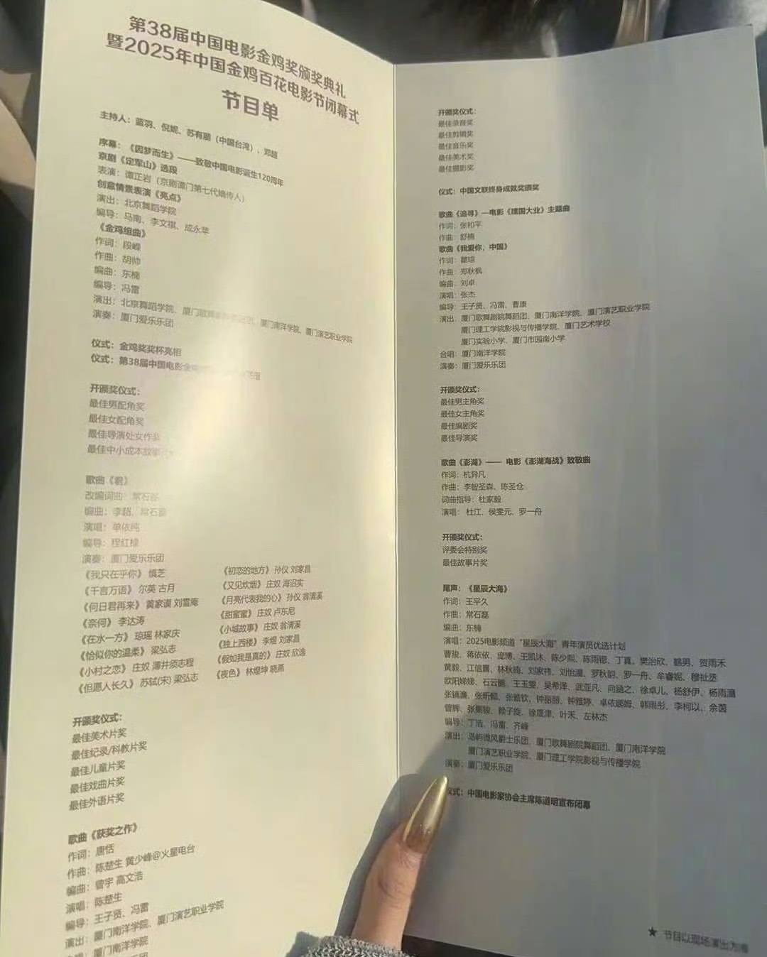 第38届金鸡奖节目单流出,颁奖典礼将于晚上19:15开始,颁奖顺序如下:最佳男配角最佳女配角最佳导演处女作最佳中小成本故事片最佳美术片最佳纪录/科教片最佳儿童片最佳戏曲片最佳外语片最佳录音最佳剪辑最佳音乐最佳美术最佳摄影最佳男主角最佳女主角最佳编剧最佳导演评委会特别奖最佳故事片