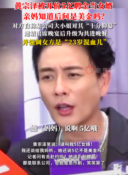 而在今年10月份的时候,黄宗泽在接受媒体采访时还透露,自己被开价五亿聘金当女婿,对方自称某公司大小姐,对他很是仰慕,原本是邀请他出席晚宴活动,后面这个晚宴活动就升级成了两人共进晚餐,而且对方是23岁的混血儿,当时的黄宗泽还洋洋得意的表示原来自己竟然价值五亿。