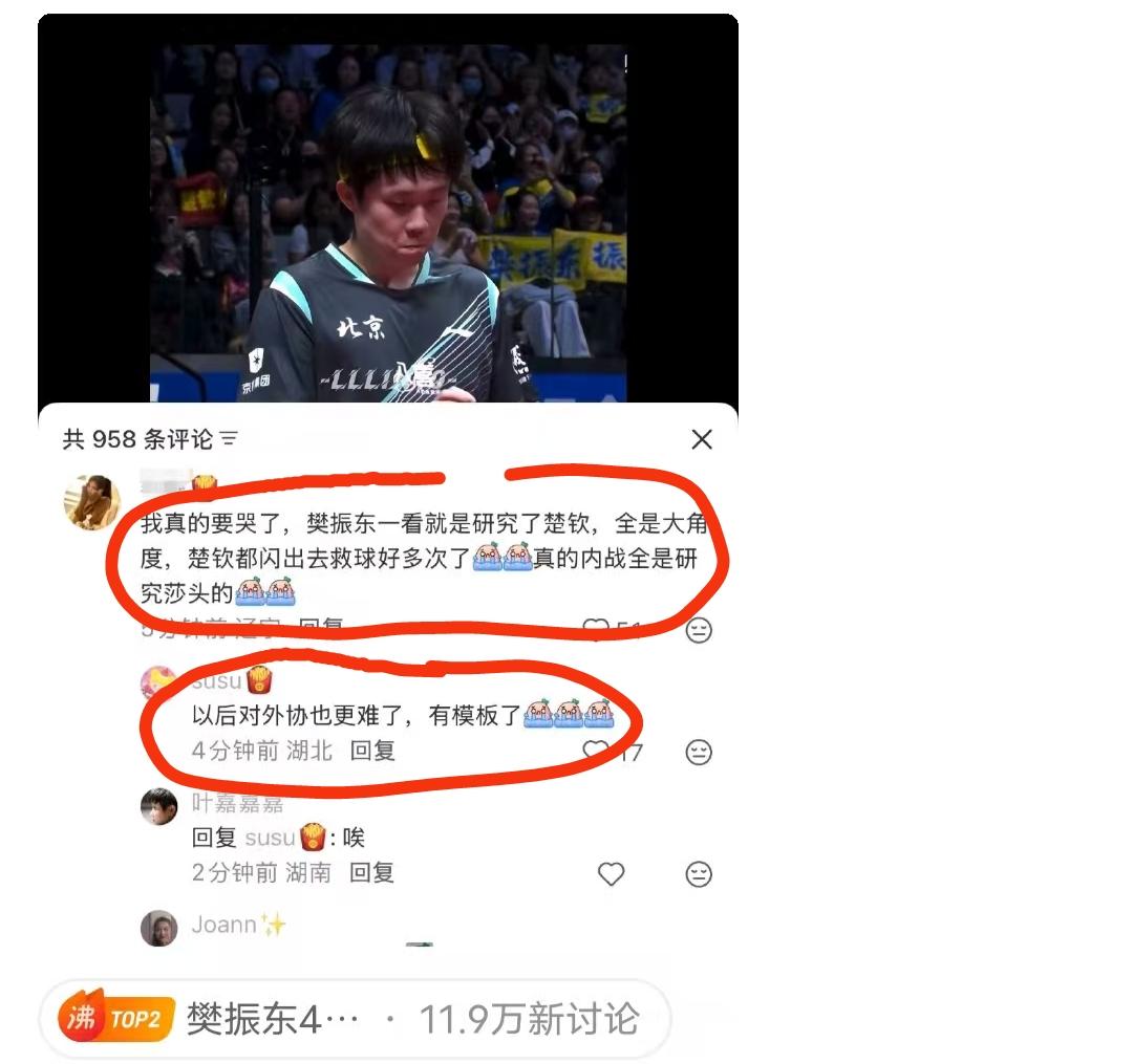 王楚钦2:4不敌樊振东,无缘全运会乒乓球男子单打决赛。赛后,王楚钦粉丝发言:樊振东研究透了王楚钦,内战全是研究莎头的…… 更有粉丝表示:以后对外协也更难了,有模板了! 如此看来,王楚钦还是有很多短板,还得勤加苦练。而不是今天参加这个品牌代言会,明天参加那个粉丝见面会。 真的不知道这些粉丝是为他好,还是把他带坑里面去?
