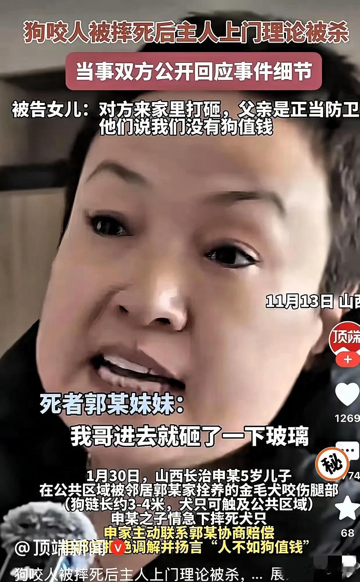 长治这案子,那么简单的问题,现在搞得那么复杂,全是因为郭家人这些嘴脸! 你说吧,你家养的狗咬了人,你不出来道歉,赔偿就说不过去了。还要仗这自己人多,九个人闯进人家私宅,这是要干什么? 再看看事后郭嘉姐妹的采访,看她们的嘴脸,一个劲的在狡辩,看看窗玻璃都烂成什么样子了?就只是砸了一下玻璃? 现在知道一个劲的在狡辩了?当初就是一个道歉,赔偿就能解决的事,为什么要带那么多人上门去呢? 面对那么多人上门动手威胁,总不能不还手吧!
