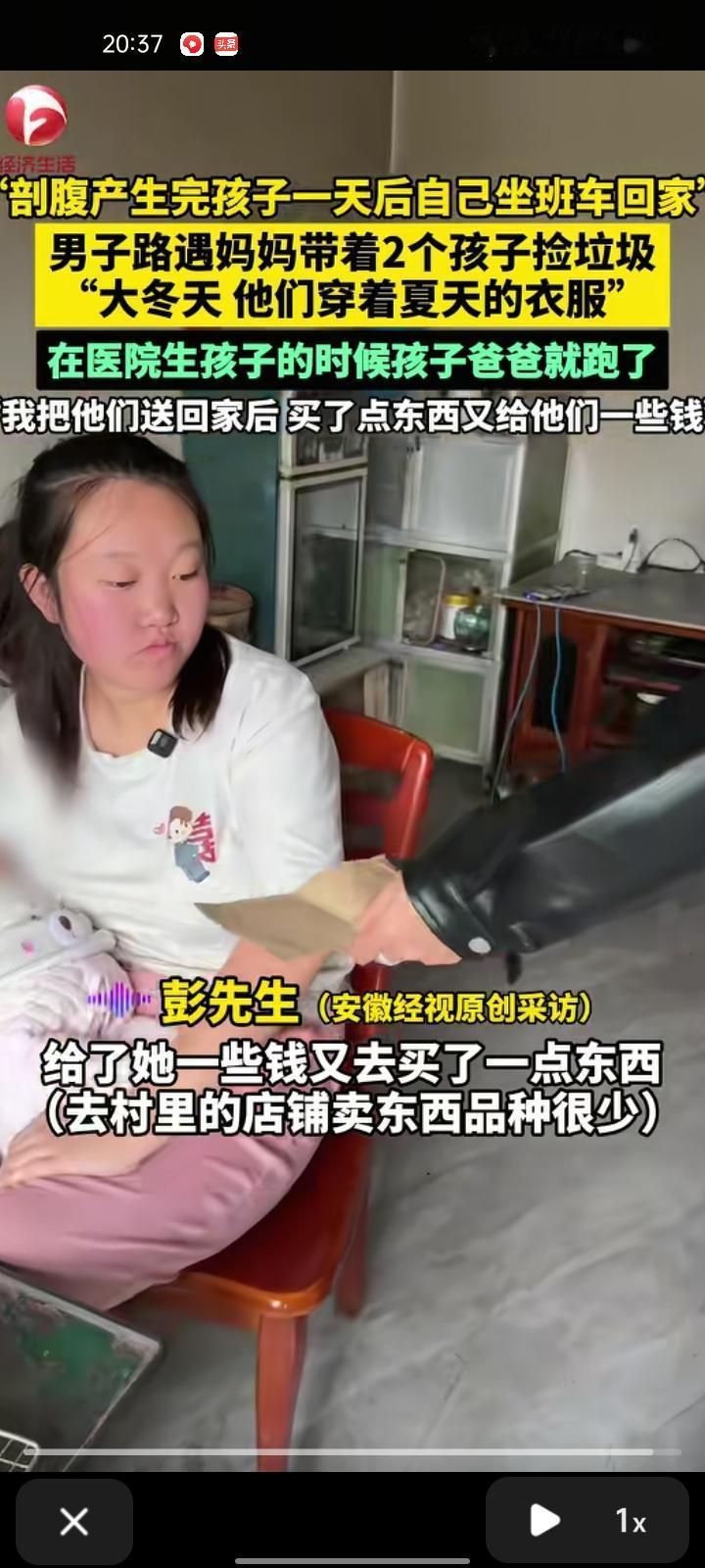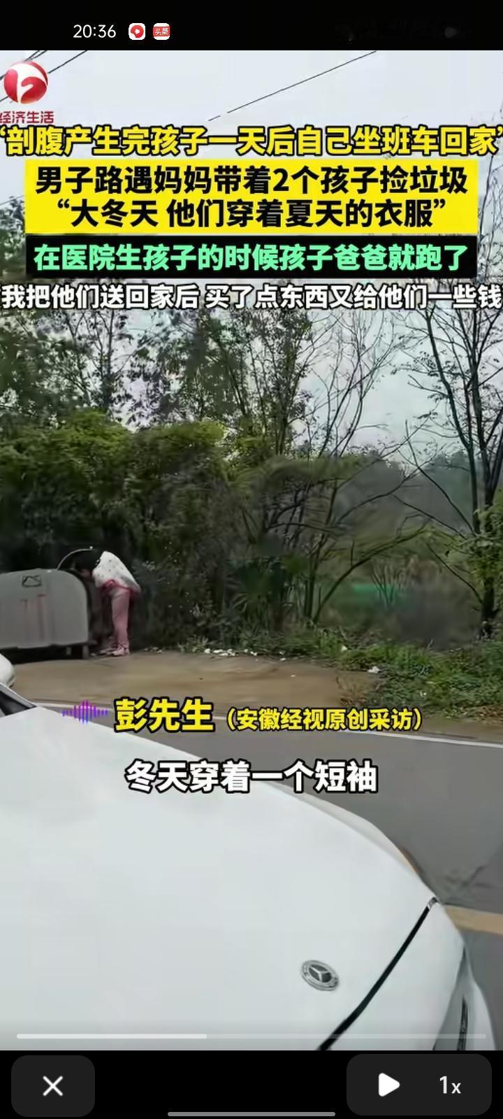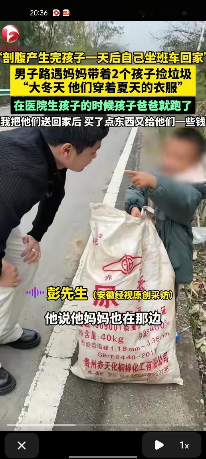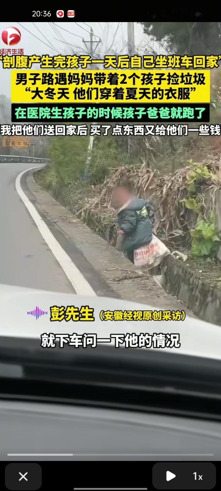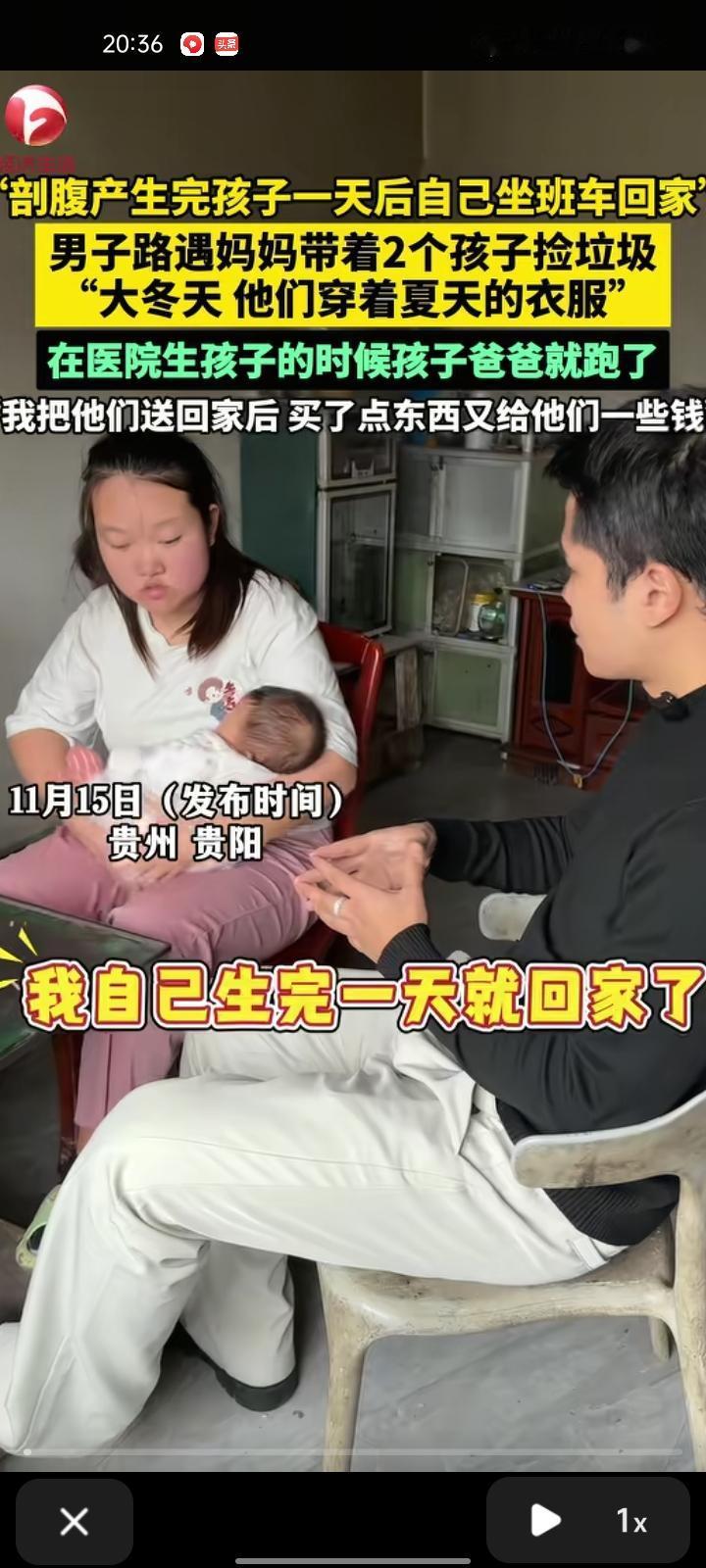 11月14日,贵州贵阳。男子在路上遇到妈妈带着两个孩子捡垃圾,大冬天的孩子妈妈穿着短袖,问了才知道,她是没有衣服穿了。随后,男子把孩子妈妈送回家,跟孩子妈妈说明情况。 经询问,孩子妈妈的遭遇大致是这样的:她大概20岁,大的5岁,小的两个月,老公在她生孩子的时候就跑了,他说是去外省打工来着,之后就拉黑她的联系方式了,最后是她一个人在医院完成生产的,生产当天坐班车回家。 了解完情况后,男子给他一些钱,又去买点东西