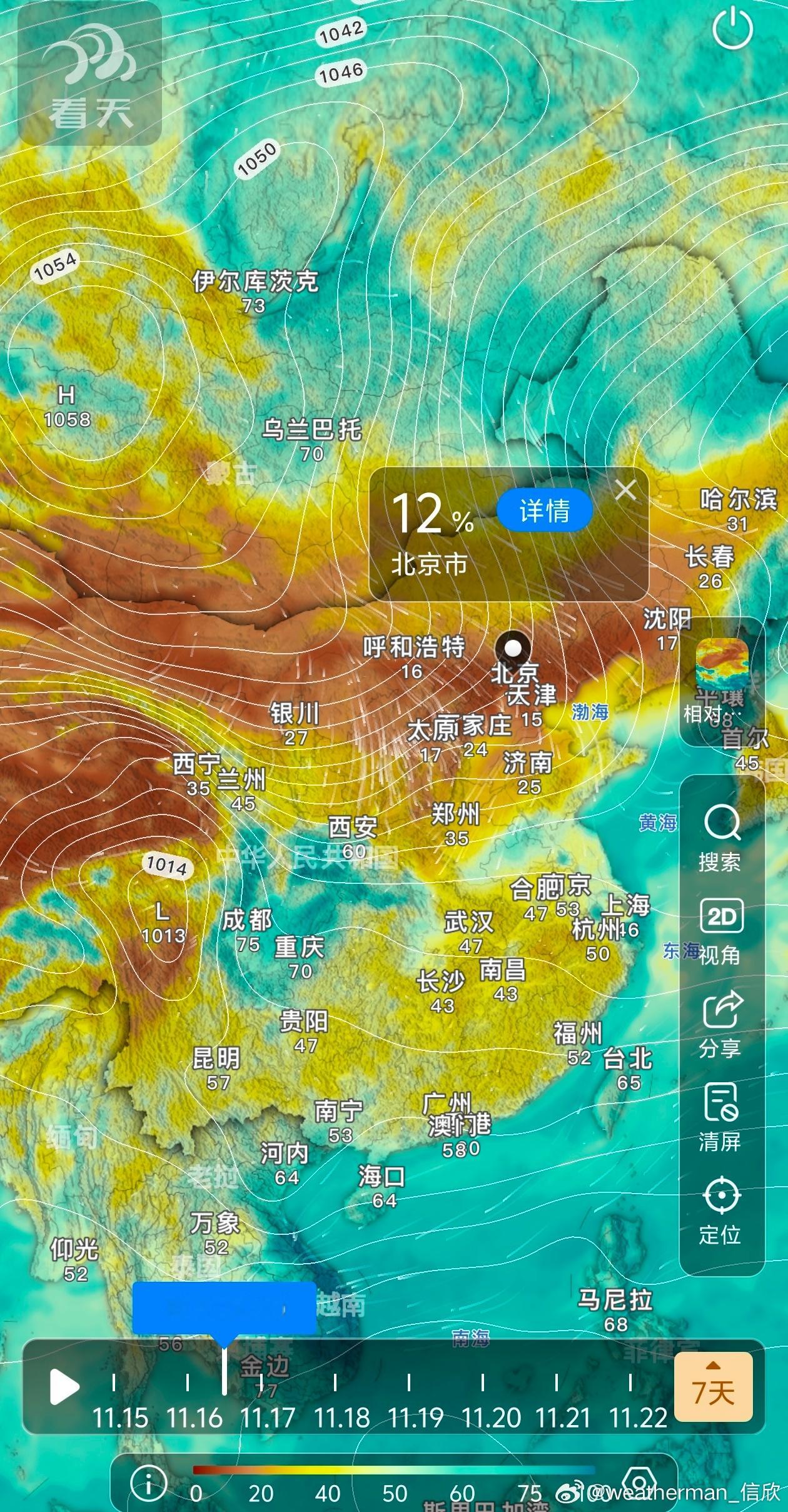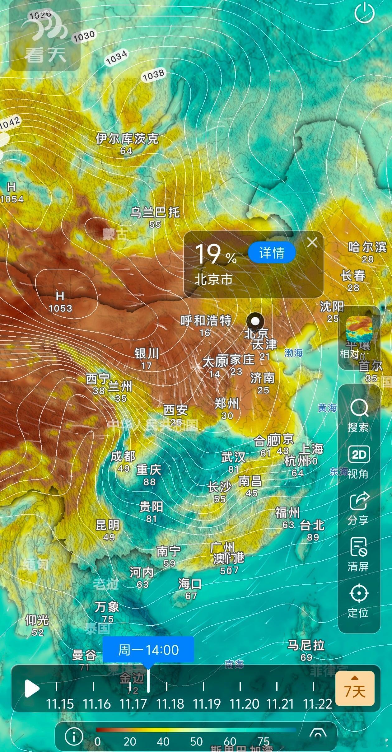 【大风和干燥】未来2天寒潮南下,将导致中东部以及东部和南部海区出现大风。对应形势场,气压梯度大,等压线密集。而且北方多地空气也会变得更干燥。要格外警惕火灾的发生。