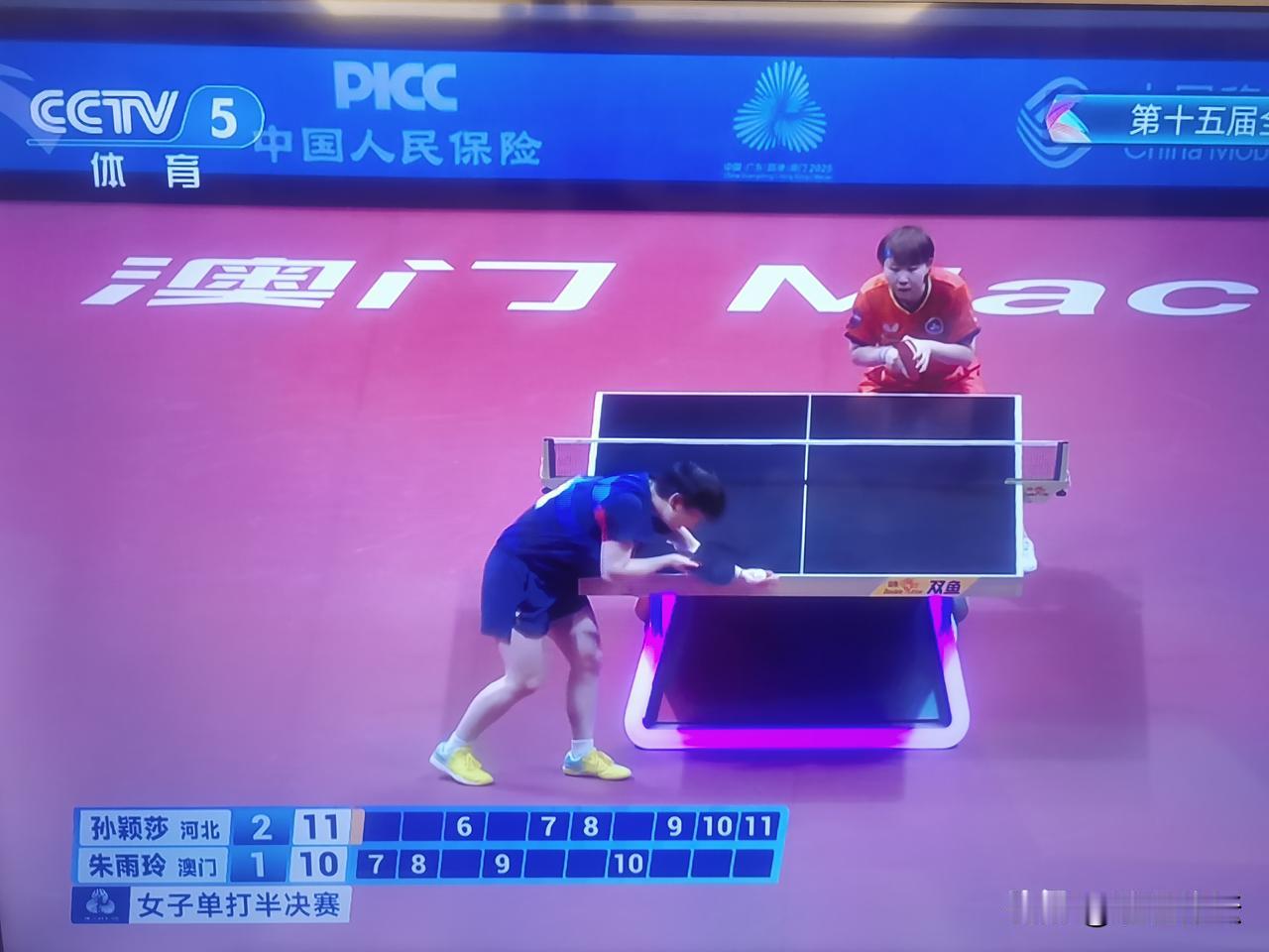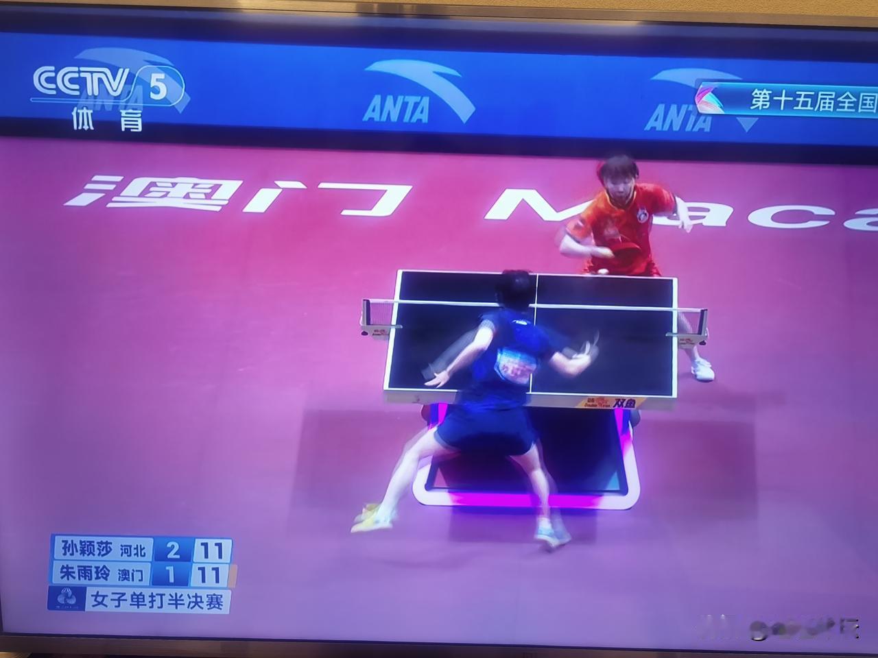 孙颖莎逆转朱雨玲,目前大比分3:1领先朱雨玲!全运会乒乓球女单半决赛,孙颖莎3:领先朱雨玲!这关键的第四局,朱雨玲在大比分领先的情况下被孙颖莎逆转取胜!通过这场比赛可以看出朱雨玲,状态非常出色,在攻防中,掌握的非常好!孙颖莎失误比较多!看好孙颖莎411战胜朱雨玲,决赛与王曼昱会师! 朱雨玲能打进女单半决赛已经非常不错,可以说是宝刀未老!