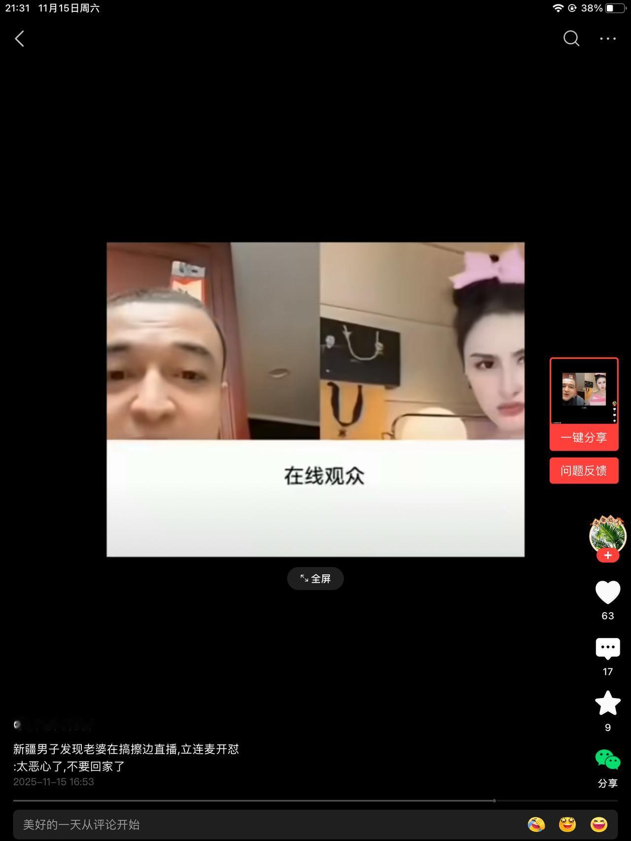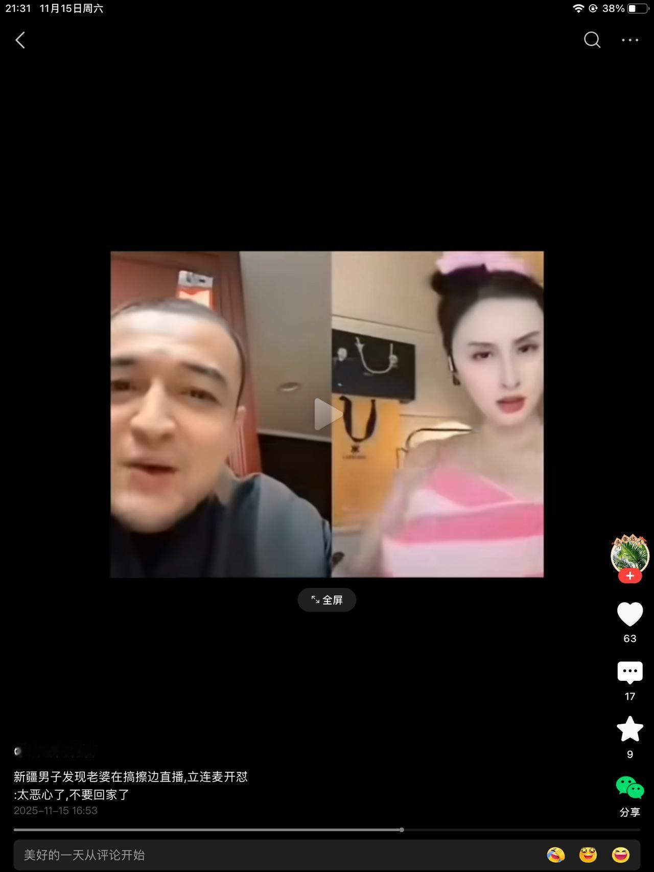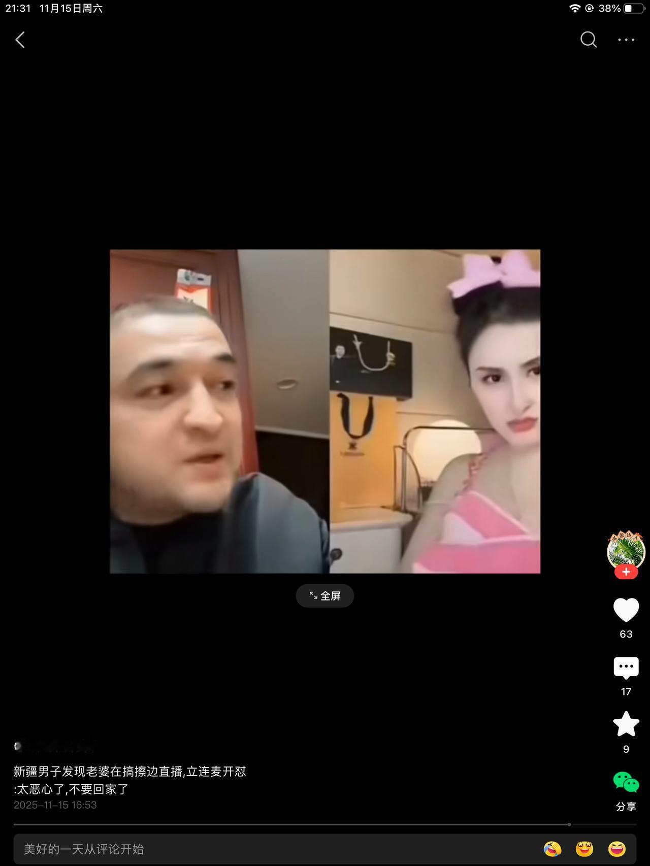 来还没睡的来点赞!新疆一男人,发现自己妻子在擦边直播,立马连麦开怼,太恶心了,不要回家了!听不懂在说什么,只听到女生说没有,没有。意思可能是没有擦边。但男人不听她的。摇头并很失望的样子。 男人不都该这样子吗?有男人气概。可以挣钱给媳妇花,不能让自己媳妇儿擦边挣钱。为撒擦边,钱太好挣了吧!习惯了擦边的话,再也不能去打工了。谁不知道打工辛苦!由俭入奢易,由奢入俭难。
