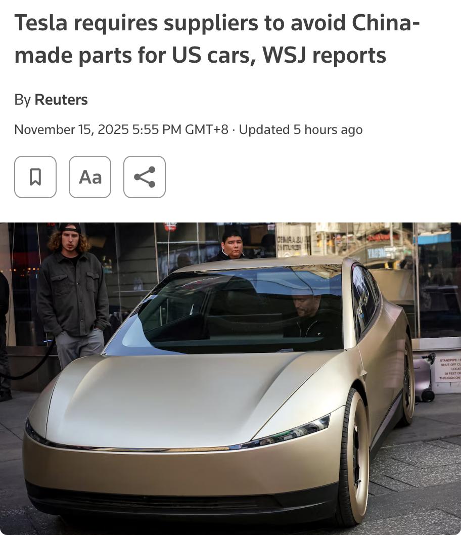 外媒:特斯拉要求其供应商在美国生产的汽车中避免使用中国制造的零部件。 特斯拉及其供应商已更换部分中国产零部件,并计划在未来一两年内将其他零部件全部切换为非中国制造。 这一举措是为了应对美中贸易争端中的关税波动,特斯拉已增加北美零部件采购以应对关税威胁。此外,通用汽车本周也要求供应商移除供应链中的中国产零部件。