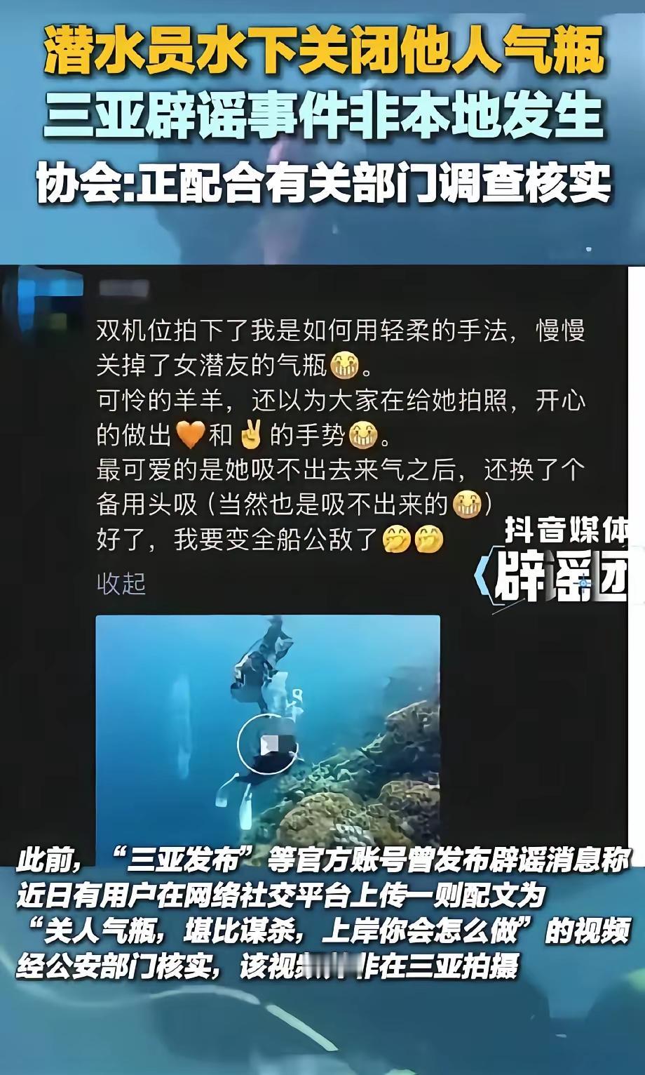 太缺德了!海底潜水时,男子关掉女潜友“洋洋”的氧气瓶,还拔了她的脚蹼,逼她生吃海胆。这是正常人干得出来的事吗?就不怕女潜友因氧气不足,急速上升时发生意外吗? 三亚景区出来辟谣,称此事未发生在本地。 网友评论: 三亚绝对能干得出这种事情,我带着孩子骑摩托艇,被驾驶员开到深海区故意甩到海里,好在穿了救生衣,要不就死在那里了!那的人太坏太坏。 这是杀人未遂犯罪!不是一句开玩笑就可以免罪吧! 不止要取消他的潜水教练资格,这种人必须判刑! 这是绝对的犯罪,作为专业人士 比普通人更懂得拔掉养气瓶的危害,在水下足以要人命,更有甚拔掉脚蹼,典型故意伤害罪。