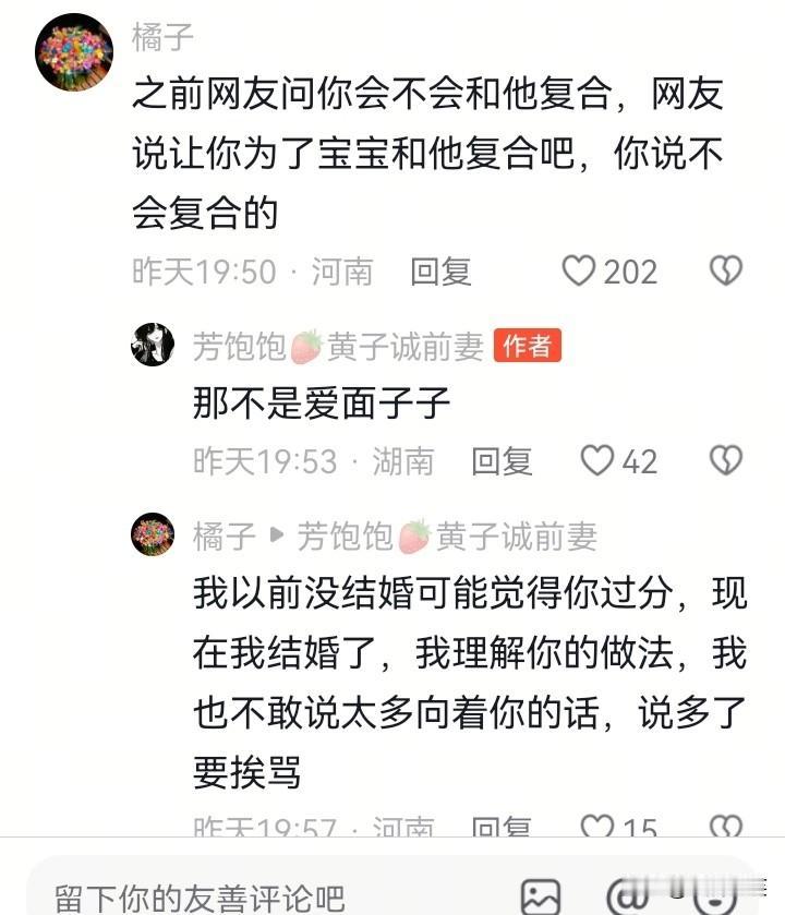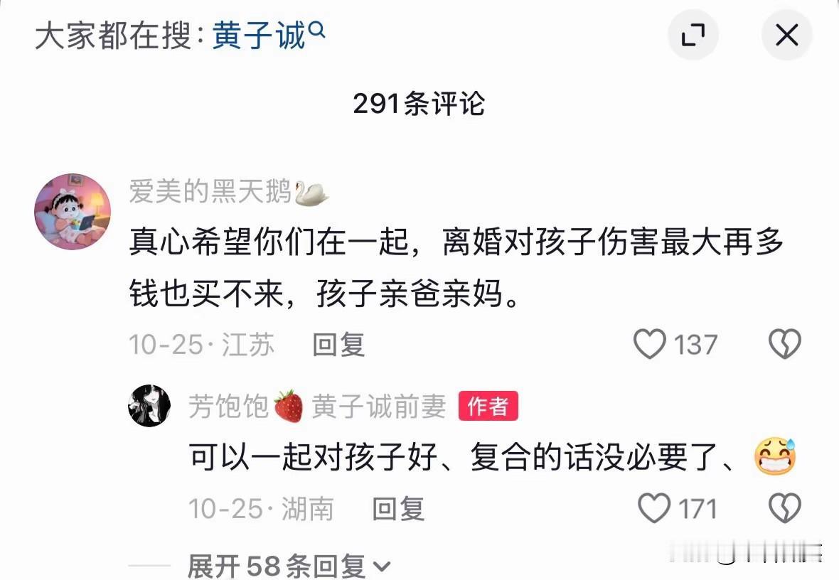 黄子诚的前妻,离婚的时候没说“孩子不能没有妈妈”,现在看黄子诚直播好起来了,又说“孩子不能没有妈妈的陪伴”,希望和黄子诚复合。 她应该是在外面“逛了一圈”,发现没有合适的,又想吃回头草了。[打脸] 现在不知道黄子诚怎么想,如果他知道自己前妻嫌贫爱富,就不能答应复合,因为万一哪一天又落魄了,妻子还会和分开。 有网友曾劝过黄子诚前妻和黄子诚复合,但她的回复是:可以一起对孩子好,复合的话没必要了。 现在网友问她当初为什么说“复和没必要了”,黄子诚前妻的回复是因为“爱面子。”[我想静静]