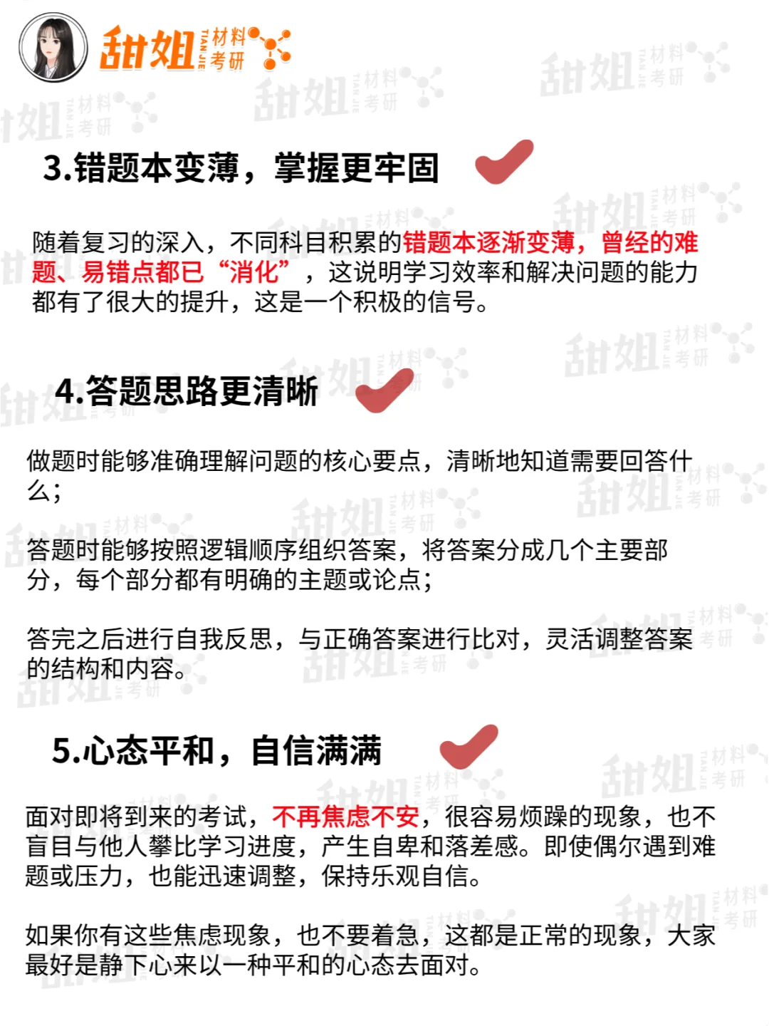 现在这个时间点,距离考研已经仅剩二十多天,很多同学的内心都不可避免的有一些茫然与焦虑,这个都是正常的。 但是大家要知道这个漫长而艰辛的备考旅程中,每一步都凝聚着你们的汗水与坚持。 今天,甜姐给大家分享一些表明你正在走上坡路的迹象,拥有的人上岸的概率是很大的哦! 26考研 25考研 材料考研 材料与化工 材料科学与工程 材料科学基础 考研上岸经验分享 考研倒计时 上岸