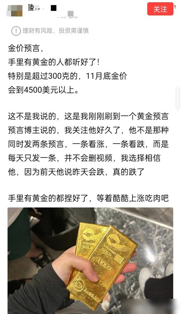 持有黄金的人千万要注意了! ​ 有位“神”友说,今年11月底黄金会涨到4500美