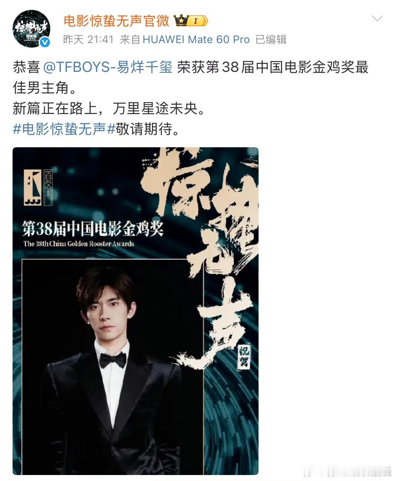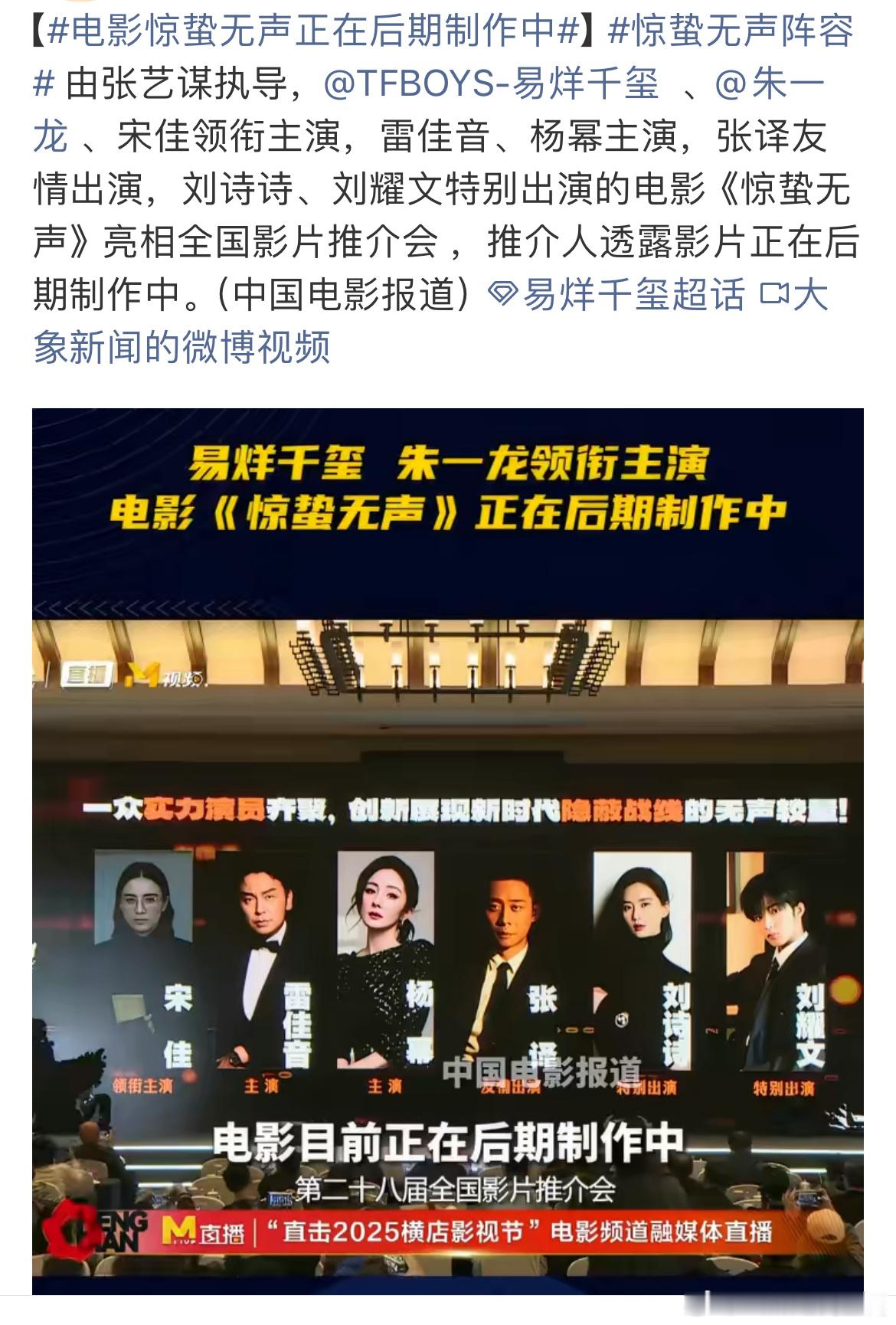 ,,, 易烊千玺、宋佳都在张艺谋电影《惊蜇无声,加上朱一龙、雷佳音、张译、杨幂、刘诗诗电影圈闭环了,这电影最少也得20亿起步吧