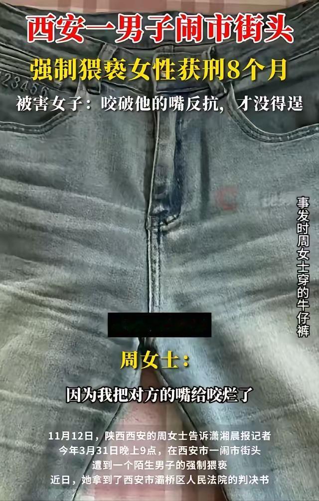 西安一女子在逛街时,突然被一陌生男子扑倒,一边扒她裤子一边强吻她,女子想推开对方,可奈何对方力气很大,完全推不动,当男子嘴接触她的嘴时,她干脆一狠心,直接咬破男子嘴唇,才让男子退却,女子趁机逃脱,蒋某某按强制猥亵罪判了8个月。 网友评论: 这个事法院判的有点轻,大路上把人压倒拆裤子,这样的事情直接是强奸未逐,按强奸罪判处3至7年有期徒刑才是最好的选择。 强奸未遂最少三年,在闹市区是情节恶劣,影响极坏,应从重处理,法官,检察官应加强学习。 光天化日之下如此狂妄,这样的恶徒不重判还会继续行恶,对犯罪的仁慈就是对善良的伤害,真的是搞不懂了。 这个社会人渣必须严判,判他个3一5年都不多,现在文明法治社会,那这种恶劣的事情,今后女孩还敢一个人在路上走吗?可怕。