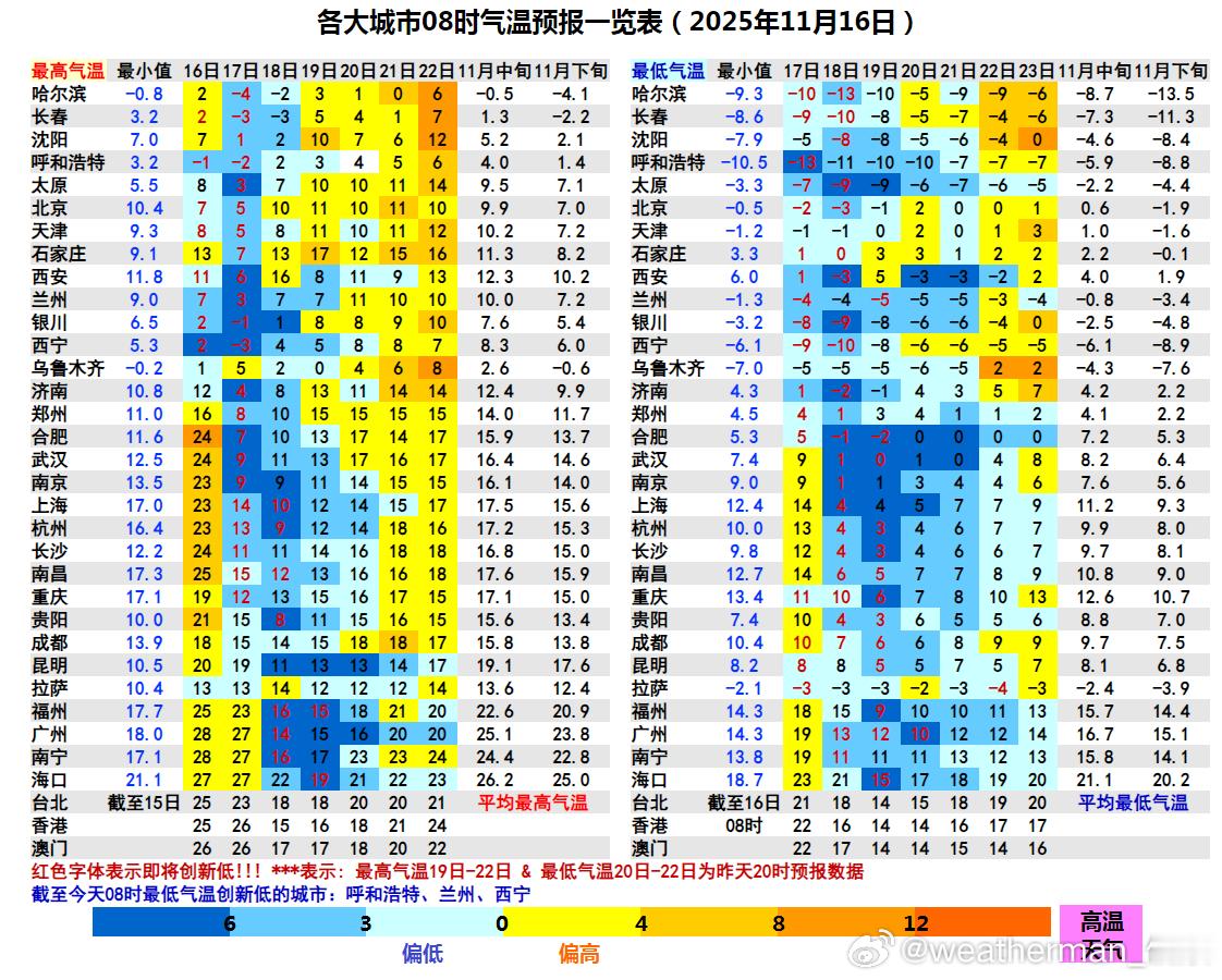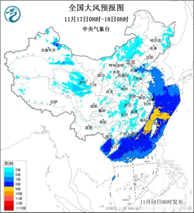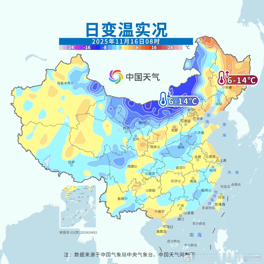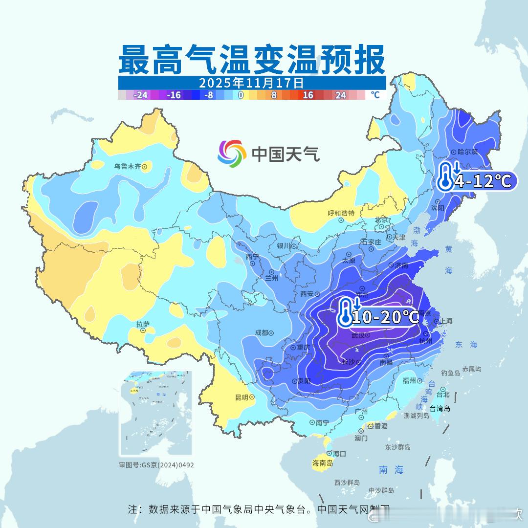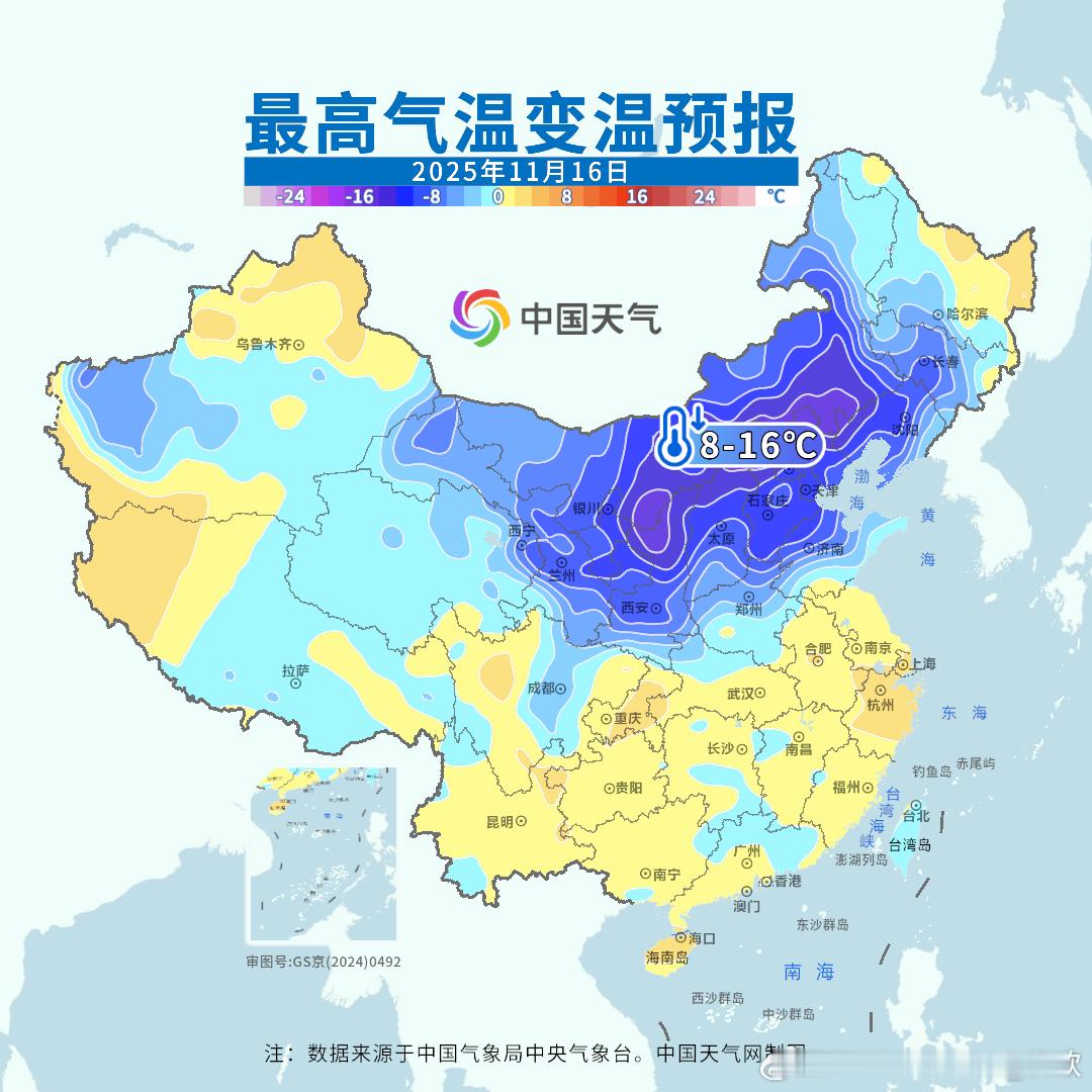 今晨实况,蒙古西部反算到海平面的冷高压有1075百帕,说明冷空气实力非常强,配得上寒潮等级。今晨内蒙古等地已经出现剧烈降温,截至8时最低,呼和浩特零下10.5℃,为立秋后首次跌破跌破零下10℃,创出新低。未来寒潮继续东移南下,我国绝大多数地区气温将创立秋后新低。哈尔滨长春最低气温也将降至零下10℃以下,西安济南合肥最低气温将是立秋后首次跌破0℃。而且这次中东部的降温,还伴随大风,不仅北方,南方的风也不小,风寒效应导致,体感温度会更低。
