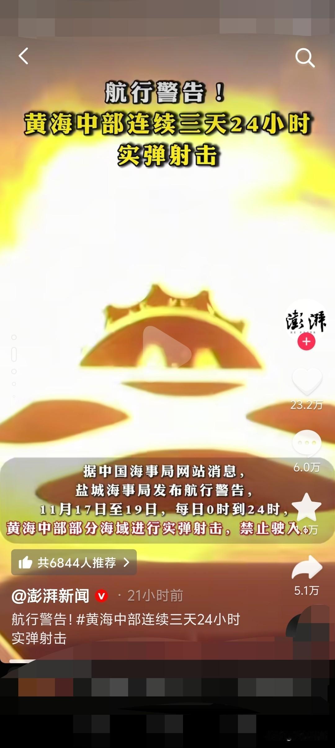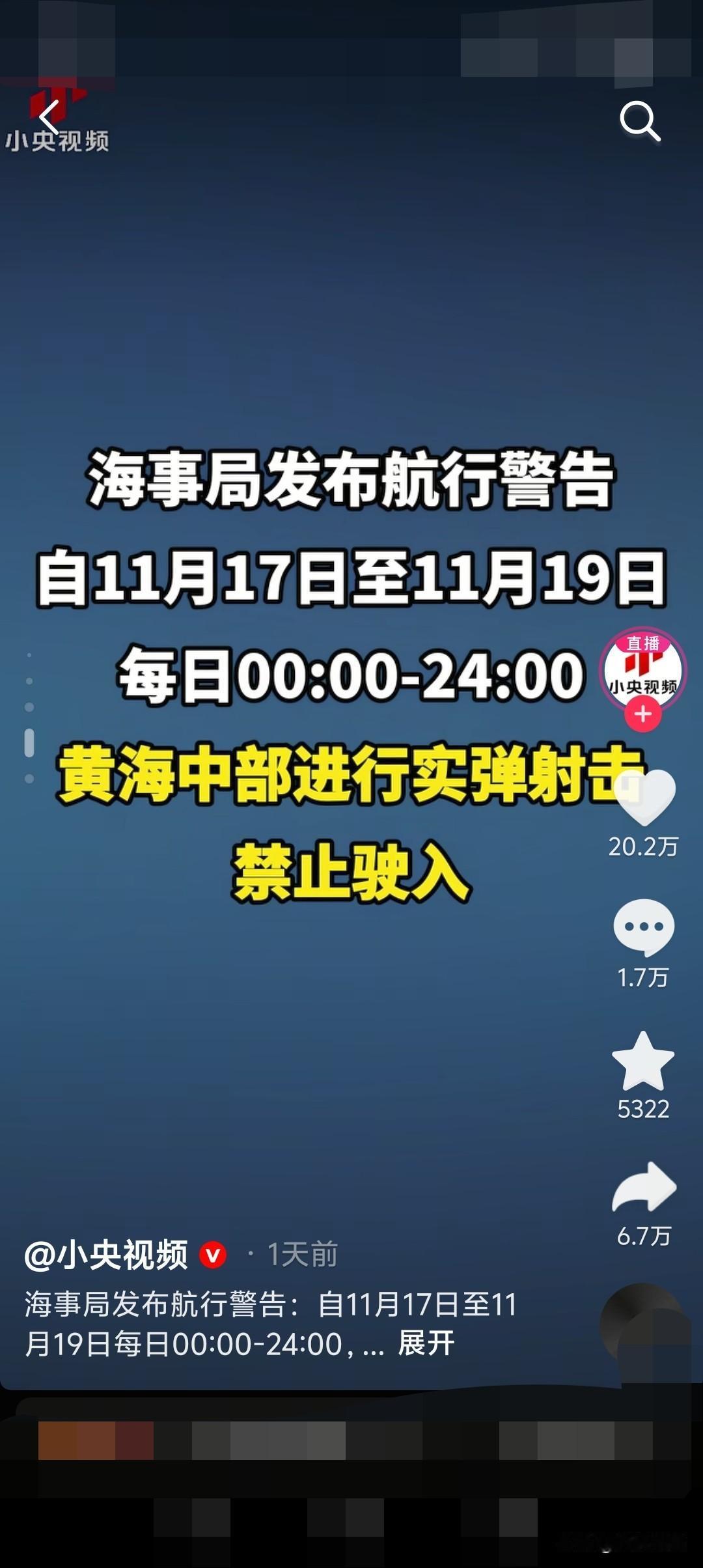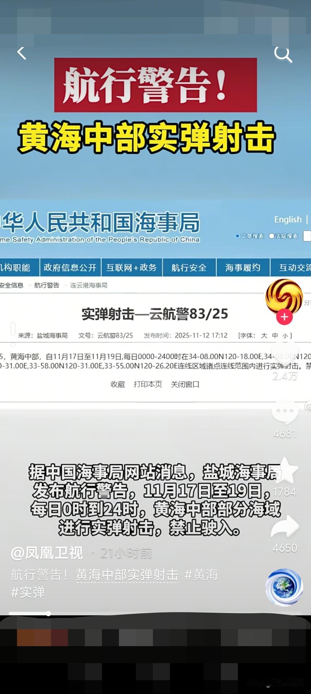 记住这不是演习,记住这不是演习,黄海实弹射击,这不是演习,是严厉警告,严厉警告。 11月15号,中国海事部门发布了航行警告,黄海中部海域从17号开始将进行连续三天的实弹射击,时间从每天0时起到24时停止,全天不间断的演习。和以前的演习不一样的是,这一次公告里面没有出现过军事演习或者演练等这些的字眼,就用了实弹射击这四个字就直接定性了,都不用修饰的。 而这一次划定的区域就位于黄海的中部,靠近中韩的专属经济区的重叠水域,地理位置可以说是非常的敏感了。它不直接的靠近我们国家土地的核心区域,但是正好在西太平洋地缘格局的关键节点上上面,刚好距离日本九州岛就差数百公里,对驻在日本的美军部分前沿的部署构成了战略投影。突然发现,这个发布的时间,又刚好与日本政客高市早苗在涉台问题上的持续发表错误言论同步? 高市早苗最近一直在说,台湾有事就是日本有事,甚至都在暗示日本可能介入台海局势,严重的违背了一个中国原则,也间接的突破了中日关系的政治底线。中方已经明确的表达强烈不满和严正交涉。而这一次的实弹射击的突然宣布,虽然没有说是谁,但是已经很清楚了,有些话还是不能乱讲,有些红线也不能乱踩的。 但是这一次有点特殊的是,并没有公布具体的坐标范围,也没有说明参演的兵力和武器的类型,信息很模糊。但也正好是这种看透不说透的方法,反而让外界那些国家感到了更大的压力。一想到要连续72个小时的不间断实弹射击,不仅要对装备和人员的战备水平的考验,也更是一种高强度和高密度的战略姿态释放。 这已经不是一次普通的训练了,而是一次有明确目的,有清晰意图的军事上的示警。 军事行动从来都不只是军事本身。在敏感的时候加上敏感的海域,直接最直接的方式告诉他们,我们就是一种语言。 以前像这样的活动我们通常都会解释这是一场演习演练,都会给其他国家留有一点余地,也会给别人一点的解读空间。但是这一次,连演都不用说了,直接用实弹射击四个字。这就像是一场谈话,对方不停的插话和挑衅,你不用再解释了,直接把东西放在桌上,动作就这么的简单,反正意思就是那个意思,自己体会。 高市早苗说的话并不是孤立的事件,而是最近几年来部分日本政客都在试图的借台海的问题来提升自己的存在感,来迎其他国家势力的表现。他们恐怕都会以为中国只会口头上的抗议,根本不会采取什么实质性回应。但结果就是,中国的反制就是,我不想说,我想直接做。 就在上个月,中国海军舰艇编队穿越了大隅海峡,由东海进入了太平洋,航线已经紧贴日本的本土了,引发了日方紧急的跟踪监视。到现在,黄海的实弹射击直接告诉了他的答案,现在的情况就是,我们第一次是机动的展示,然后就是火力上威慑;一次是你看到我来了,然后告诉你我已经准备好了,你呢? 这种方式的回答,又能避免局势的骤然升级,还能持续的传递到压力,体现出了我们在处理复杂的外部挑战时候的策略,我们虽然不轻易动武,但是绝对不能来挑衅。 台湾是中国的一部分,这已经不是外交立场了,而是刻在了我们民族记忆里的共识。任何的外部势力妄图插手台海事务,都是在挑战我们最核心的利益。 虽然我们始终主张以和平的方式来解决争端,也很愿意以最大诚意来推动两岸关系的发展。但是,和平的前提是尊重,不是纵容。如果有人一边享受着对华经贸合作带来的红利,又一边在政治上不断捅我们刀子,甚至为台独势力撑腰打气,那就不能指望中国永远克制了。 实弹射击不是为了开战,而是为了止战。它的真正目的,是让那些头脑发热的人冷静下来:你可以发表自己观点,但要为自己的话负责;你也可以表明自己的立场,但也别低估了一个国家捍卫主权的决心。 我们不愿意打,但是不怕打。我们坚持走和平发展的道路,但我们也没有承诺过要放弃使用武力的打算,和平需要用实力来守护,尊严需要用行动来证明。 三天的实弹射击虽然会结束,航警解除,海面会恢复平静。但是它的声音,不会就这么轻易散去的。 中国没有扩大事情,也没有情绪化的对抗,而是选择了在一个刚好的时间和一个刚好的地点,用一种刚刚好的方式表达了自己的态度。 我们的大门一直是开着的,但是前提是我们都是尊重对方。如果非要一意孤行,一直在试探,那么我们下一次的回答,或许就已经不是警告了,而是真正实在的行动了。 这一次,黄海没有演习。 有的,只是实弹。 而实弹,从不演习。