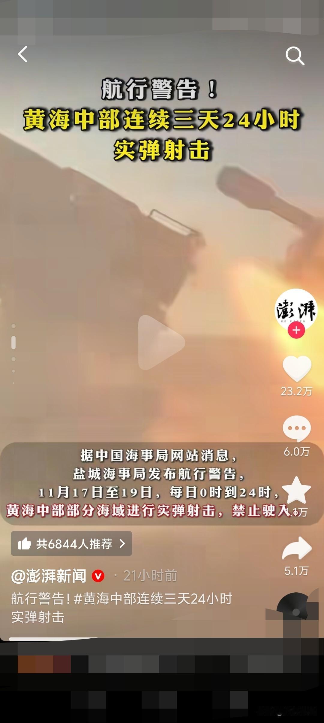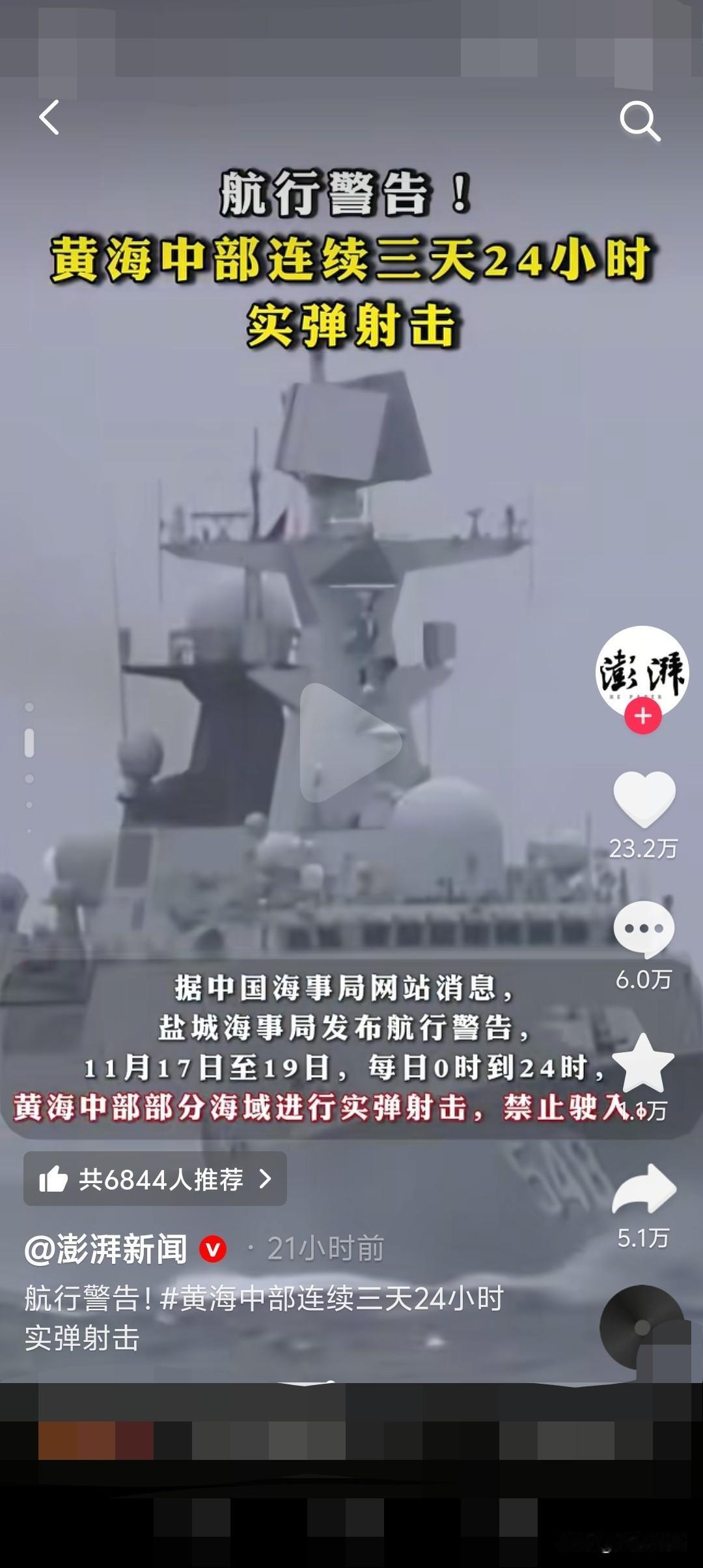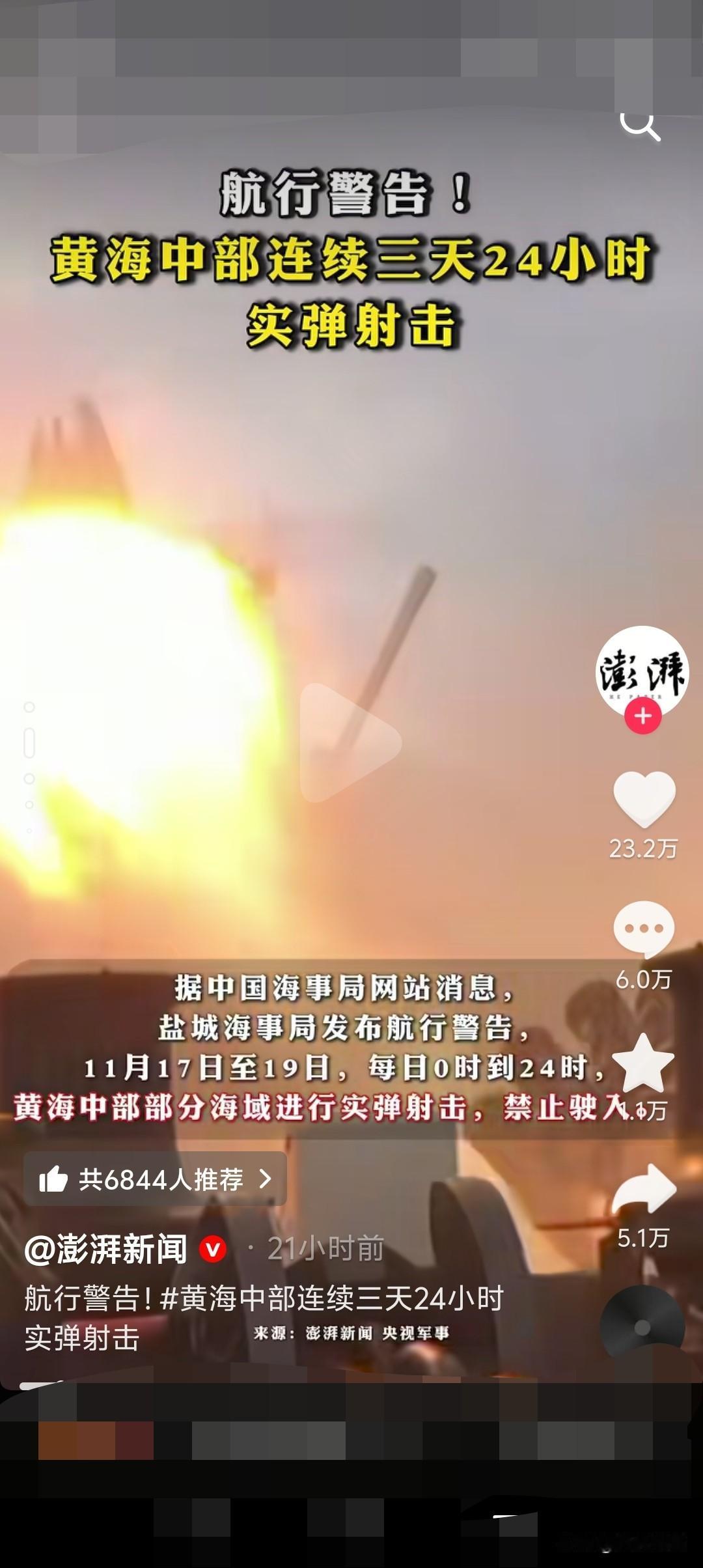 记住这不是演习,记住这不是演习,黄海实弹射击,这不是演习,是严厉警告,严厉警告。 11月15号,中国海事部门发布了航行警告,黄海中部海域从17号开始将进行连续三天的实弹射击,时间从每天0时起到24时停止,全天不间断的演习。和以前的演习不一样的是,这一次公告里面没有出现过军事演习或者演练等这些的字眼,就用了实弹射击这四个字就直接定性了,都不用修饰的。 而这一次划定的区域就位于黄海的中部,靠近中韩的专属经济区的重叠水域,地理位置可以说是非常的敏感了。它不直接的靠近我们国家土地的核心区域,但是正好在西太平洋地缘格局的关键节点上上面,刚好距离日本九州岛就差数百公里,对驻在日本的美军部分前沿的部署构成了战略投影。突然发现,这个发布的时间,又刚好与日本政客高市早苗在涉台问题上的持续发表错误言论同步? 高市早苗最近一直在说,台湾有事就是日本有事,甚至都在暗示日本可能介入台海局势,严重的违背了一个中国原则,也间接的突破了中日关系的政治底线。中方已经明确的表达强烈不满和严正交涉。而这一次的实弹射击的突然宣布,虽然没有说是谁,但是已经很清楚了,有些话还是不能乱讲,有些红线也不能乱踩的。 但是这一次有点特殊的是,并没有公布具体的坐标范围,也没有说明参演的兵力和武器的类型,信息很模糊。但也正好是这种看透不说透的方法,反而让外界那些国家感到了更大的压力。一想到要连续72个小时的不间断实弹射击,不仅要对装备和人员的战备水平的考验,也更是一种高强度和高密度的战略姿态释放。 这已经不是一次普通的训练了,而是一次有明确目的,有清晰意图的军事上的示警。 军事行动从来都不只是军事本身。在敏感的时候加上敏感的海域,直接最直接的方式告诉他们,我们就是一种语言。 以前像这样的活动我们通常都会解释这是一场演习演练,都会给其他国家留有一点余地,也会给别人一点的解读空间。但是这一次,连演都不用说了,直接用实弹射击四个字。这就像是一场谈话,对方不停的插话和挑衅,你不用再解释了,直接把东西放在桌上,动作就这么的简单,反正意思就是那个意思,自己体会。 高市早苗说的话并不是孤立的事件,而是最近几年来部分日本政客都在试图的借台海的问题来提升自己的存在感,来迎其他国家势力的表现。他们恐怕都会以为中国只会口头上的抗议,根本不会采取什么实质性回应。但结果就是,中国的反制就是,我不想说,我想直接做。 就在上个月,中国海军舰艇编队穿越了大隅海峡,由东海进入了太平洋,航线已经紧贴日本的本土了,引发了日方紧急的跟踪监视。到现在,黄海的实弹射击直接告诉了他的答案,现在的情况就是,我们第一次是机动的展示,然后就是火力上威慑;一次是你看到我来了,然后告诉你我已经准备好了,你呢? 这种方式的回答,又能避免局势的骤然升级,还能持续的传递到压力,体现出了我们在处理复杂的外部挑战时候的策略,我们虽然不轻易动武,但是绝对不能来挑衅。 台湾是中国的一部分,这已经不是外交立场了,而是刻在了我们民族记忆里的共识。任何的外部势力妄图插手台海事务,都是在挑战我们最核心的利益。 虽然我们始终主张以和平的方式来解决争端,也很愿意以最大诚意来推动两岸关系的发展。但是,和平的前提是尊重,不是纵容。如果有人一边享受着对华经贸合作带来的红利,又一边在政治上不断捅我们刀子,甚至为台独势力撑腰打气,那就不能指望中国永远克制了。 实弹射击不是为了开战,而是为了止战。它的真正目的,是让那些头脑发热的人冷静下来:你可以发表自己观点,但要为自己的话负责;你也可以表明自己的立场,但也别低估了一个国家捍卫主权的决心。 我们不愿意打,但是不怕打。我们坚持走和平发展的道路,但我们也没有承诺过要放弃使用武力的打算,和平需要用实力来守护,尊严需要用行动来证明。 三天的实弹射击虽然会结束,航警解除,海面会恢复平静。但是它的声音,不会就这么轻易散去的。 中国没有扩大事情,也没有情绪化的对抗,而是选择了在一个刚好的时间和一个刚好的地点,用一种刚刚好的方式表达了自己的态度。 我们的大门一直是开着的,但是前提是我们都是尊重对方。如果非要一意孤行,一直在试探,那么我们下一次的回答,或许就已经不是警告了,而是真正实在的行动了。 这一次,黄海没有演习。 有的,只是实弹。 而实弹,从不演习。