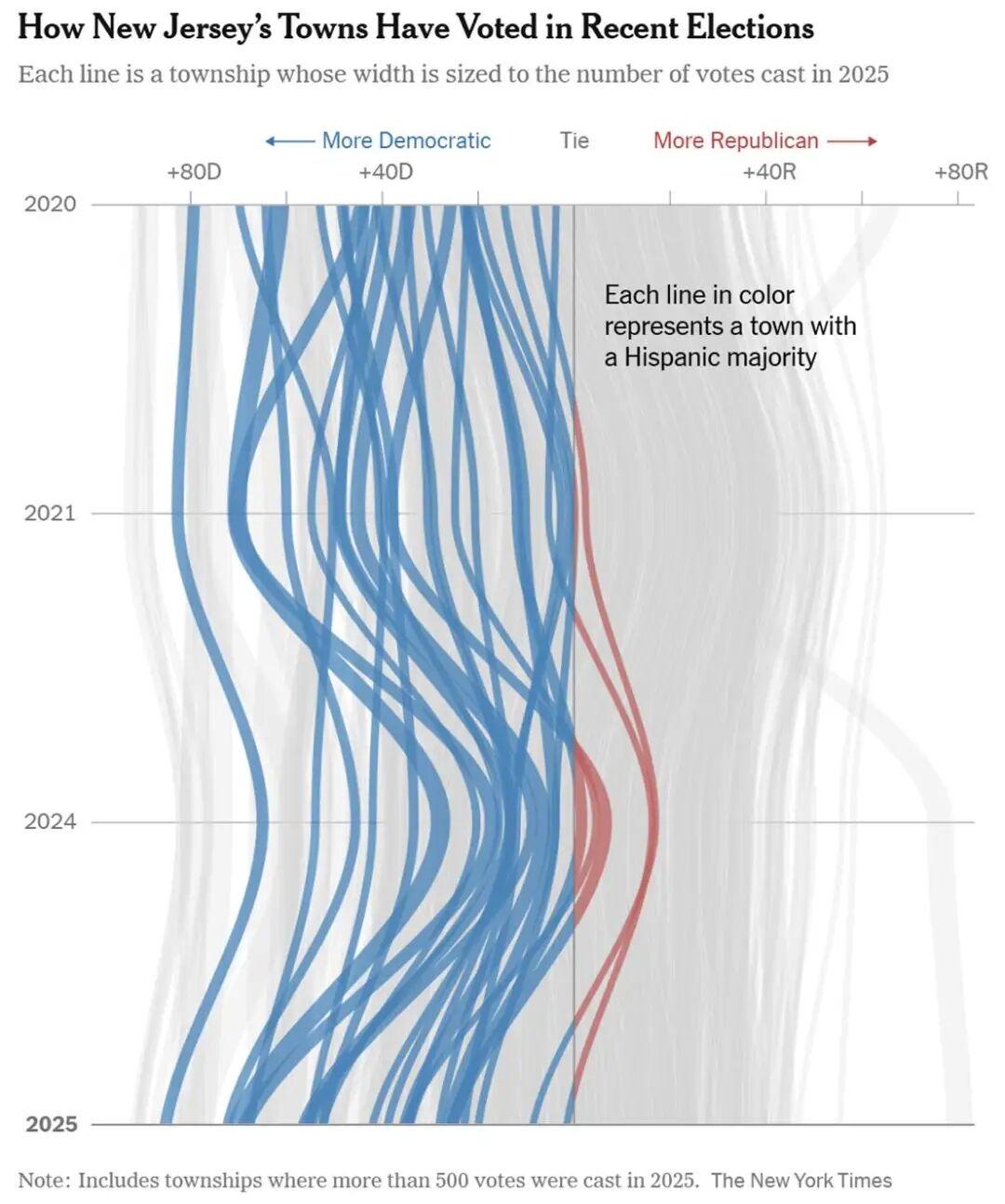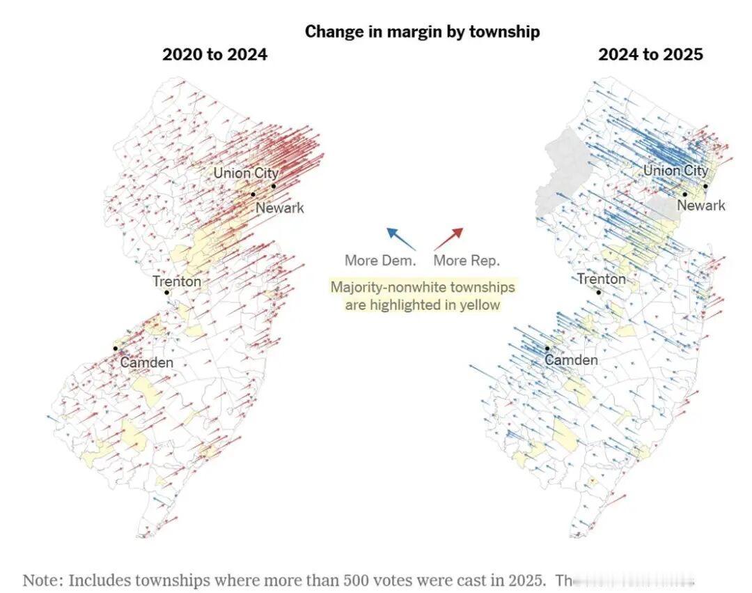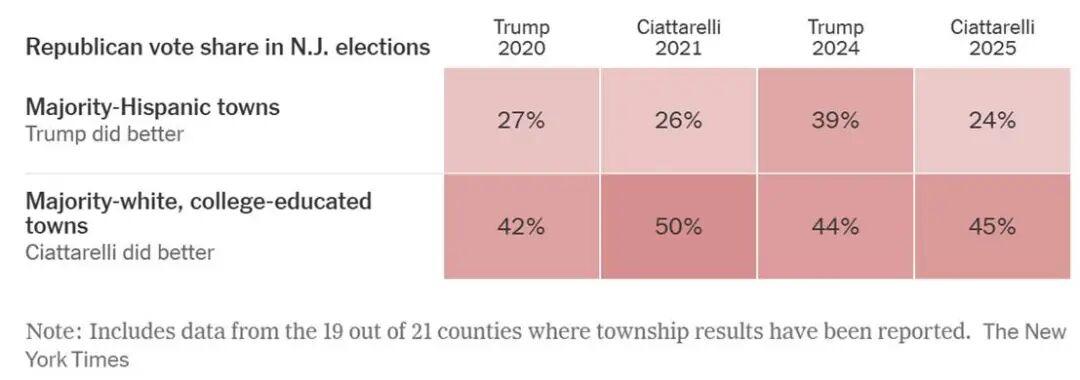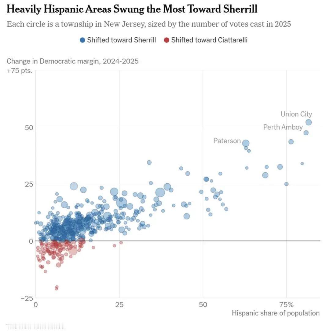 据《纽约时报》对近期新泽西州州长选举的乡镇层级数据分析显示,在这次选举中,民主党夺回了在2024年总统选举中从拉丁裔选民那里流失的大部分支持。结果十分显著:2025年向左大幅摆动的高比例拉丁裔地区,几乎与2024年向右大幅摆动的地区形成镜像。这表明,特朗普去年在拉丁裔选民中出现的支持激增可能是短暂的,或者至少较难由党内其他候选人继承。 图片来源于网络