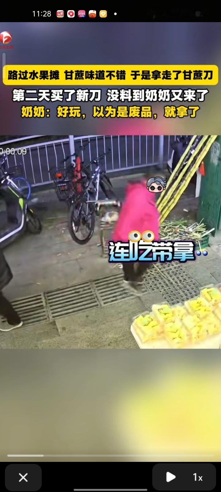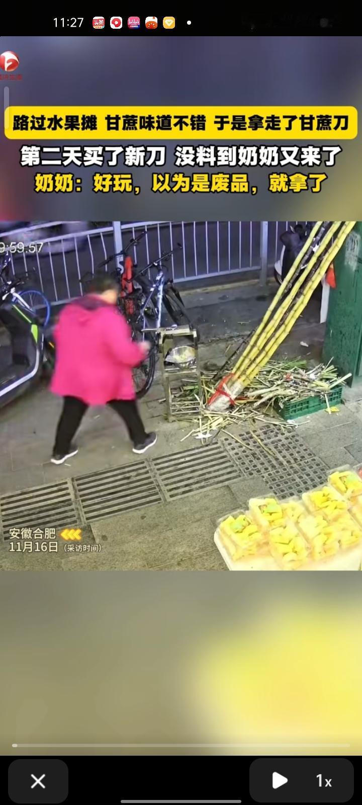 11月16日,安徽合肥。监控画面显示,一位老人路过水果摊,先尝尝甘蔗,顺手把甘蔗刀拿走。第二天,老板买了新刀,大概六点钟甘蔗刀刚到店里,过了两小时又被老人拿走了。 老板报警后,警察询问老人后得知,她是觉得好玩,以为是废品就拿了。