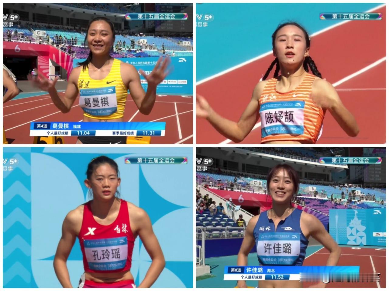 全运会-女子100米(预赛)梁小静因伤退赛,葛曼棋和“小孩姐”陈妤颉拿到前两名。 女子100米预赛成绩前八名—— 第一名,福建队-葛曼棋,11秒36; 第二名,浙江队-陈妤颉,11秒384; 第三名,吉林队-孔玲瑶,11秒39,新PB; 第四名,湖北队-许佳璐,11秒55; 第五名,广西队-韦永丽,11秒57; 第六名,安徽队-史琳琪,11秒58,新PB; 第七名,四川队-刘峡君,11秒59; 第八名,上海队-潘越,11秒613。 梁小静,在4x100混合接力的比赛中摔倒 疑似伤到了肩部,为了团队有一个有效成绩坚持跑完了比赛,但是应该些许加重了伤势,不得不退赛100米的个人单项。