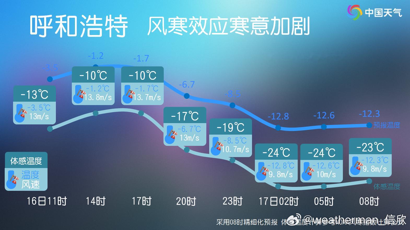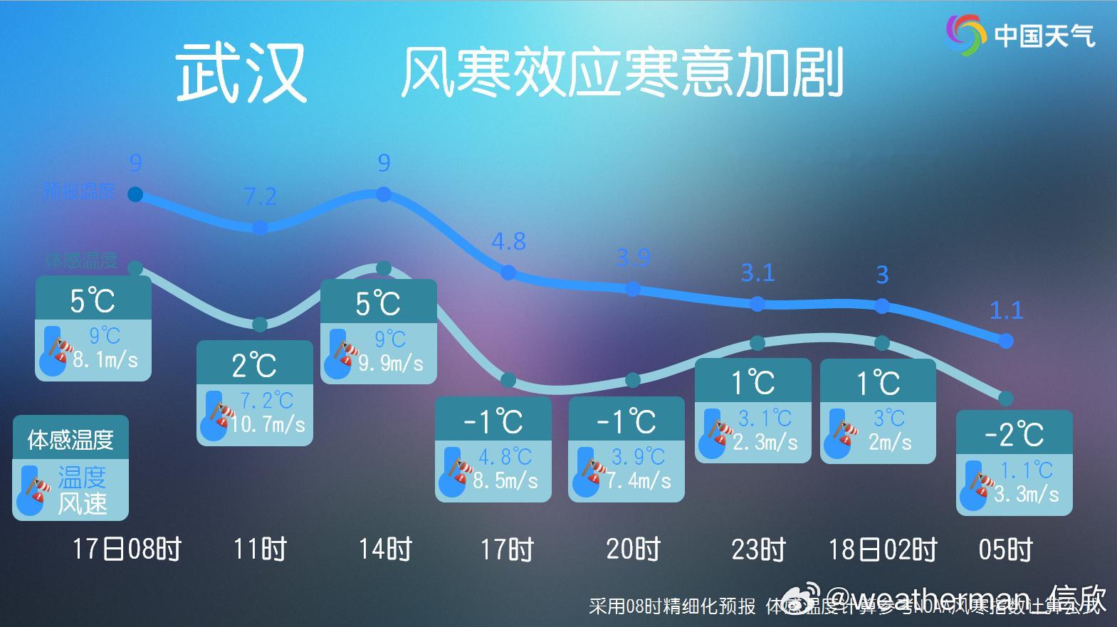 【风寒效应】今天上午,内蒙古到山东北部多地,出现了6级以上的阵风。大风会快速带走体表的热量,导致体感温度更低。今天呼和浩特的体感温度就可能比实际气温低8-10℃。明天南方的风也会明显加大,武汉也会体验到风寒效应,体感温度可能比实际气温低4-5℃。