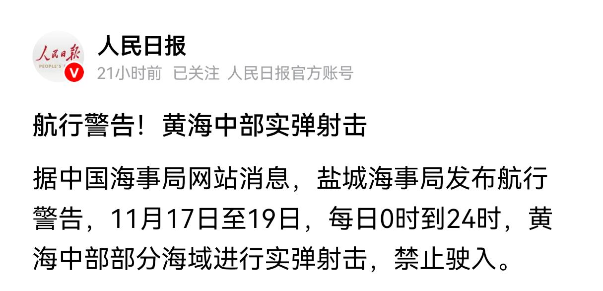 率先开火?中国刚公布黄海演习,日本自卫队就抢先发视频挑衅 11月15号,我们的海事单位对外发布了从17号一直到19号将会在黄海中部海域进行军事实弹演习。 从地区局势背景来看,此次演习与近期日本涉台言论有着密切的联系,应该是我军作出的一种战略性的震慑行动。 不过我们的海事单位发布了这则消息之后,同一天,日本自卫队也发了一条视频,画面中展示了日本战舰集结并且开火的画面。并专门配上文字,说:战舰火炮准备就绪,预备,开火。 日本自卫队在这样的一个时间节点上发布这样的视频,很显然是在舆论上想要针锋相对的对我们即将进行的黄海军事演习进行回应,甚至是隔空叫阵。 不过在我看来,日本自卫队其实有更好的反制方法,因为解放军已经公布了黄海演习的大致范围和时间段,日本这个时候可以集中自己的精锐海空力量,在同样的时间前往同样的海域,只有那样才叫真正的针锋相对。这种只是发发文字发发视频的做法,只能暴露他们那点见不得光的野心,以及他们自身的实力。